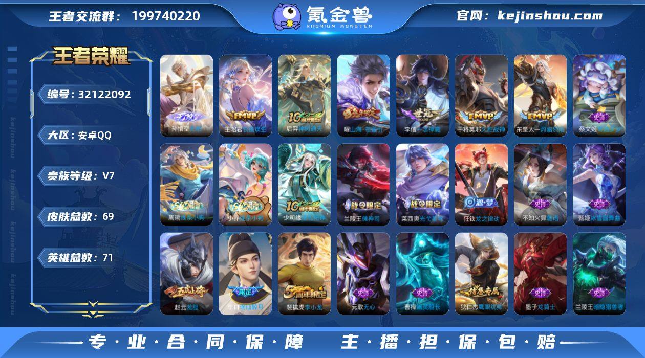 安卓Q-V7-最强王者段位-71英雄-69皮肤-2无双-9传说-28史诗【英雄全皮】:孙权全皮,敖隐全皮【无双皮肤】:李信问心剑,孙悟空无相【传说皮肤】:阿轲罗刹妄海,韩信踏浪归,貂蝉神骥聚万邦,王昭君长夜焕生,后羿神树通天,东皇太一灼幽烈阳,曜山海苍雷引,李信一念神魔,干将莫邪久胜战神【限定皮肤】:李白谪仙醉月,狄仁杰阴阳师,赵云皇家上将,赵云龙胆,元歌无心,狄仁杰魔术师,项羽海滩派对,李元芳匿光侦查者,裴擒虎李小龙,米莱狄胡桃异想国,曜山海苍雷引【年限皮肤】:曜山海苍雷引【赛季限定】:亚瑟荣光之誓【战令限定】:米莱狄胡桃异想国,兰陵王傩神司,莱西奥光弋星穹,明世隐往忆晖光,周瑜线条小狗,小乔线条小狗【史诗皮肤】:盘古撼世英歌,蔡文姬奇遇梦乡,周瑜线条小狗,小乔线条小狗,少司缘巫礼祀神,兰陵王傩神司,莱西奥光弋星穹,狂铁龙之律动,李白谪仙醉月,姜子牙闲日渔趣,李元芳匿光侦查者,米莱狄完美假期,元歌无心,米莱狄胡桃异想国,裴擒虎李小龙,赵云龙胆,不知火舞魅语,狄仁杰鹰眼统帅,孙策猫狗日记,兰陵王暗隐猎兽者,小乔缤纷独角兽,曹操幽灵船长,墨子龙骑士,妲己魅力维加斯,孙尚香水果甜心,狄仁杰魔术师,王昭君偶像歌手,甄姬冰雪圆舞曲,赵云皇家上将【其他皮肤】:吕布舞狮寰,鲁班七号班班快跑,妲己线条小狗,桑启线条小狗,蒙恬苍云破阵,安琪拉糖果风暴,虞姬溯影追猎,蚩奼极光幻客,曹操逐霄之志,艾琳鹤鸣心笺,孙权径山谋武,明世隐往忆晖光,亚瑟荣光之誓,西施雪境奇遇,朵莉亚金色潮汐,牛魔牛运亨通,妲己紫罗兰之誓,张良缤纷绘卷,小乔丁香结,王昭君幻想奇妙夜,关羽龙腾万里,狄仁杰阴阳师,甄姬花好人间,达摩拳王,亚瑟死亡骑士,妲己少女阿狸,项羽海滩派对,雅典娜战争女神【营地ID】:1565519593