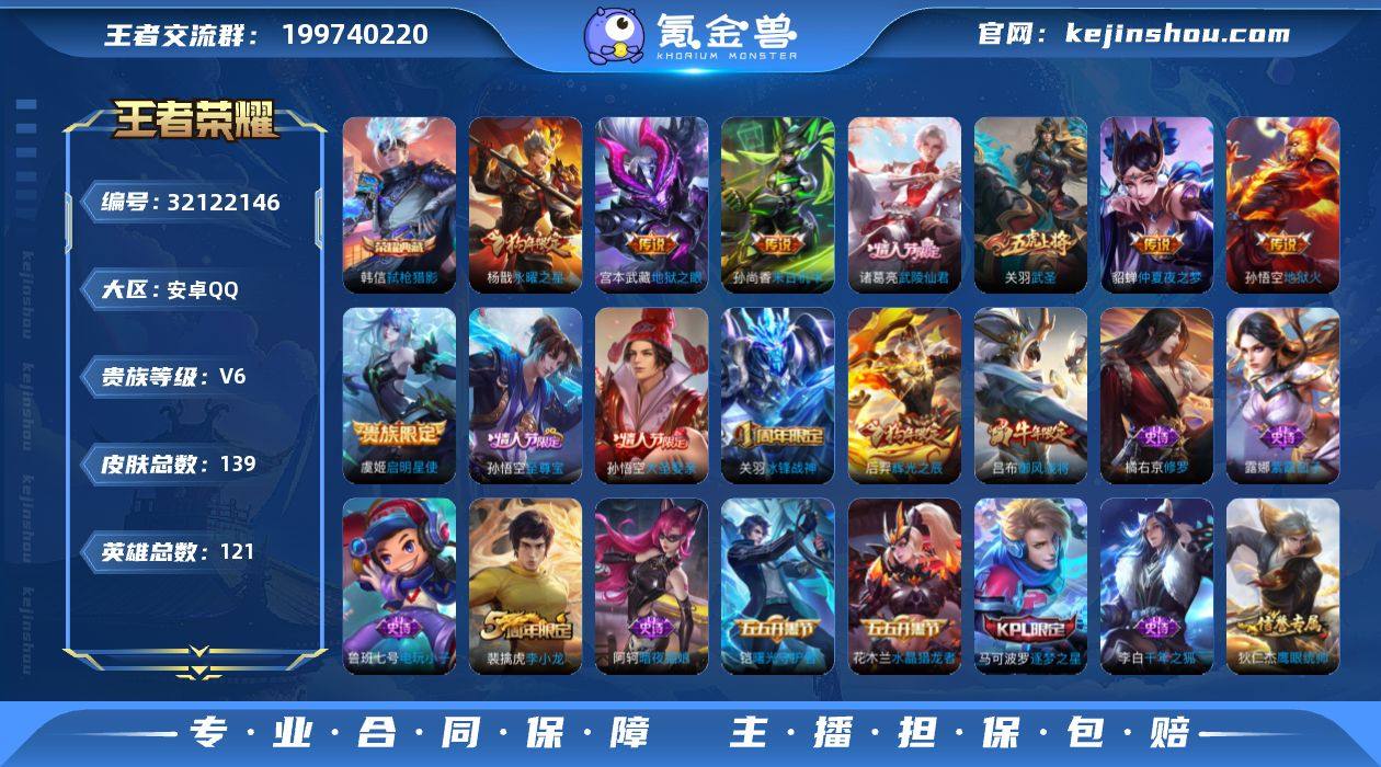 安卓Q-V6-尊贵铂金IV段位-121英雄-139皮肤-1典藏皮肤-8传说-35史诗【荣耀典藏】:韩信弑枪猎影【传说皮肤】:虞姬启明星使,关羽武圣,杨戬永曜之星,诸葛亮武陵仙君,貂蝉仲夏夜之梦,孙尚香末日机甲,宫本武藏地狱之眼,孙悟空地狱火【限定皮肤】:狄仁杰阴阳师,赵云皇家上将,鲁班七号狮舞东方,高渐离玩趣恶龙,芈月重明,吕布御风骁将,夏侯惇朔风刀,曹操烛龙,马可波罗逐梦之星,狄仁杰魔术师,狄仁杰万华元夜,达摩沙漠行僧,项羽海滩派对,老夫子醍醐杖,关羽冰锋战神,关羽武圣,程咬金演武夺筹,兰陵王金庭之子,孙悟空至尊宝,孙悟空大圣娶亲,后羿辉光之辰,李元芳银河之约,李元芳云中旅人,虞姬启明星使,钟馗神迹守卫,钟馗驱傩正仪,杨戬永曜之星,雅典娜单词大作战,蔡文姬繁星吟游,太乙真人饕餮,鬼谷子原初探秘者,诸葛亮武陵仙君,弈星混沌棋,沈梦溪星空之诺,沈梦溪大漠名商,明世隐疑决卦,裴擒虎李小龙,狂铁御狮,米莱狄御霄,盾山御銮,蒙犽狂想玩偶喵,张良古海寻踪【年限皮肤】:杨戬永曜之星,后羿辉光之辰,吕布御风骁将【赛季限定】:太乙真人饕餮,曹操烛龙,芈月重明,狂铁御狮,米莱狄御霄,盾山御銮,夏侯惇朔风刀,弈星混沌棋,明世隐疑决卦,老夫子醍醐杖,鬼谷子原初探秘者,狄仁杰万华元夜,程咬金演武夺筹,钟馗驱傩正仪,达摩沙漠行僧,兰陵王金庭之子,沈梦溪大漠名商,李元芳云中旅人,张良古海寻踪【战令限定】:鲁班七号狮舞东方,钟馗神迹守卫,李元芳银河之约,沈梦溪星空之诺,蒙犽狂想玩偶喵,雅典娜单词大作战【史诗皮肤】:吕布御风骁将,裴擒虎李小龙,蒙犽狂想玩偶喵,橘右京修罗,李元芳银河之约,蔡文姬繁星吟游,狄仁杰鹰眼统帅,鲁班七号狮舞东方,孙悟空大圣娶亲,程咬金功夫厨神,刘禅天才门将,铠曙光守护者,百里守约特工魅影,后羿辉光之辰,雅...