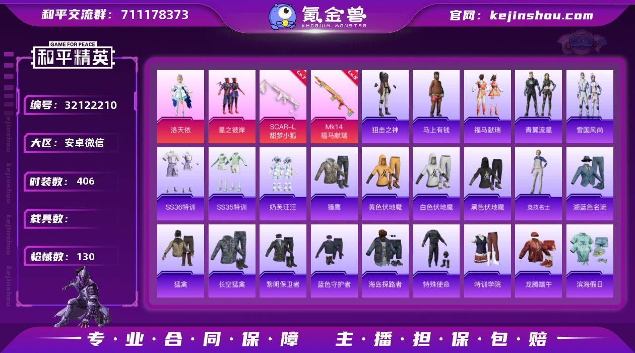 实名: 可修改 时装数: 406 枪械数: 130 热门装扮: 星之彼岸,洛天依,奶芙汪汪 稀有枪皮: SCAR-L甜梦小狐,MK14-福马献瑞 亮点: 【优质装备】:七级SCAR-L-甜梦小狐