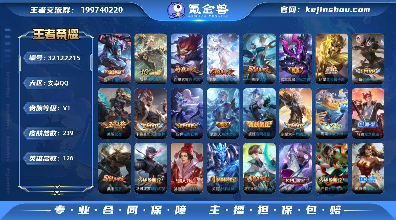 安卓Q-V0-最强王者段位-126英雄-239皮肤-1典藏皮肤-1典藏英雄-13传说-69史诗【荣耀典藏】:武则天英雄,吕布千魇归渊【传说皮肤】:后羿神树通天,女娲愿照千秋盛,东皇太一灼幽烈阳,虞姬启明星使,关羽武圣,曜云鹰飞将,伽罗太华,貂蝉猫影幻舞,干将莫邪久胜战神,达摩黄金狮子座,百里玄策白虎志,宫本武藏地狱之眼,武则天海洋之心【限定皮肤】:白起狰,狄仁杰阴阳师,虞姬凯尔特女王,赵云皇家上将,赵云龙胆,墨子神迹守卫,嬴政优雅恋人,庄周玄嵩,庄周高山流水,高渐离死亡摇滚,阿轲迷踪丽影,扁鹊炼金王,芈月重明,元歌云间偶戏,元歌无心,夏侯惇朔风刀,甄姬幽恒,曹操烛龙,典韦穷奇,典韦岱宗,马可波罗暗影游猎,马可波罗山海玄木吟,狄仁杰魔术师,狄仁杰万华元夜,达摩沙漠行僧,项羽海滩派对,老夫子醍醐杖,老夫子航海奇遇记,关羽冰锋战神,关羽武圣,程咬金演武夺筹,刘邦夺宝奇兵,韩信飞衡,兰陵王金庭之子,亚瑟潮玩骑士王,孙悟空大圣娶亲,牛魔御旌,后羿如梦令,张飞虎魄,李元芳云中旅人,虞姬霸王别姬,虞姬启明星使,钟馗驱傩正仪,杨玉环遇见飞天,雅典娜单词大作战,雅典娜黎明之约,蔡文姬繁星吟游,太乙真人饕餮,太乙真人华丽摇滚,鬼谷子原初探秘者,鬼谷子五谷丰年,黄忠烈魂,苏烈千军破阵,百里玄策白虎志,百里玄策原初追逐者,弈星混沌棋,梦奇顽趣,沈梦溪大漠名商,明世隐疑决卦,裴擒虎李小龙,裴擒虎擒涛扼浪,狂铁御狮,米莱狄御霄,云中君纤云弄巧,伽罗太华,猪八戒西部大镖客,上官婉儿梁祝,上官婉儿天狼绘梦者,蒙犽狂想玩偶喵,鲁班大师探海日志,桑启海盐诗旅,阿古朵江河有灵,张良古海寻踪,鬼谷子天穹祈灯【年限皮肤】:百里玄策白虎志,庄周玄嵩,甄姬幽恒,伽罗太华,典韦岱宗,韩信飞衡,马可波罗山海玄木吟,女娲愿照千秋盛【赛季限定】:扁鹊...