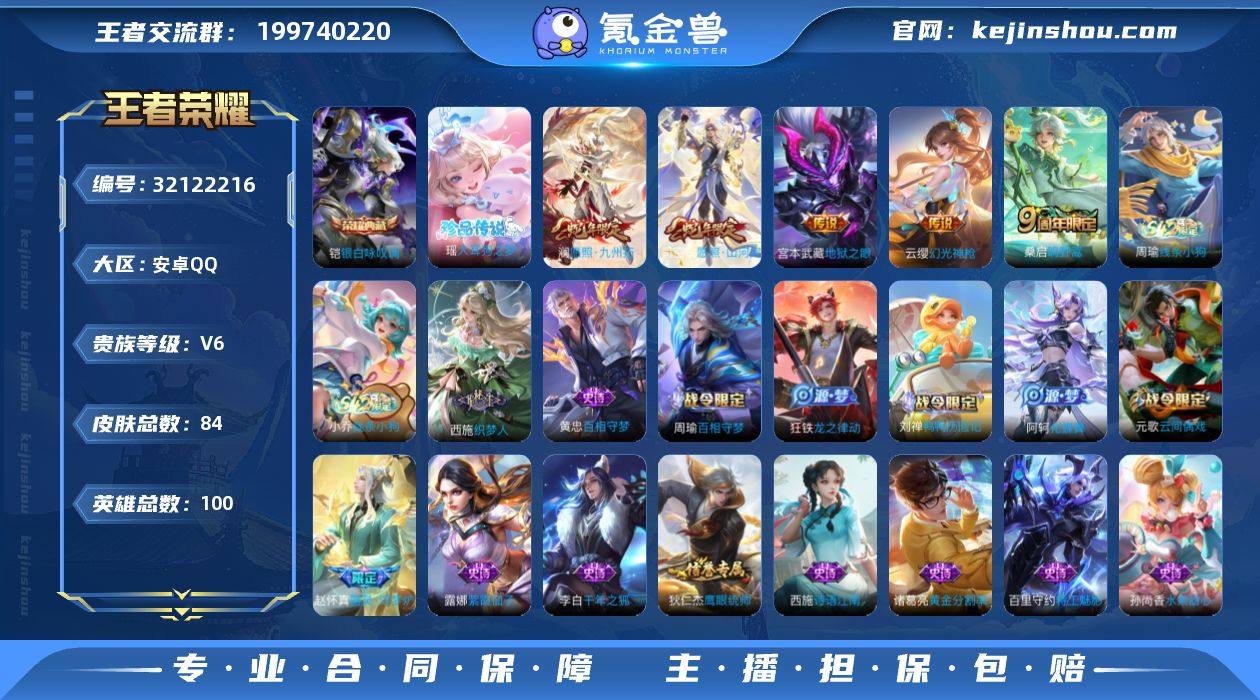 安卓Q-V6-永恒钻石IV段位-100英雄-84皮肤-1典藏皮肤-1珍品传说-6传说-27史诗【英雄全皮】:敖隐全皮【荣耀典藏】:铠银白咏叹调【珍品传说】:瑶大耳狗之梦【传说皮肤】:云缨神骥越千峰,司空震愿照山河定,澜愿照九州拓,云缨幻光神枪,桑启鸣野蒿,宫本武藏地狱之眼【限定皮肤】:狄仁杰阴阳师,赵云皇家上将,元歌云间偶戏,狄仁杰魔术师,项羽海滩派对,西施玲珑珍味,沈梦溪龙舞盛年,周瑜熔金海岸【年限皮肤】:司空震愿照山河定,澜愿照九州拓【赛季限定】:太乙真人谧流熔炉,钟馗虚灵犬护,甄姬逆浪荇歌【战令限定】:元歌云间偶戏,西施玲珑珍味,刘禅鸭鸭历险记,沈梦溪鸭鸭历险记,周瑜百相守梦,孙策百相守梦,周瑜线条小狗,小乔线条小狗【史诗皮肤】:明世隐百晓客,周瑜线条小狗,小乔线条小狗,西施织梦人,黄忠百相守梦,周瑜百相守梦,狂铁龙之律动,刘禅鸭鸭历险记,阿轲化蝶舞,赵怀真器灵浮梦炉,镜玫瑰异探,西施诗语江南,元歌云间偶戏,狄仁杰鹰眼统帅,李元芳逐浪之夏,百里守约特工魅影,雅典娜冰冠公主,诸葛亮黄金分割率,李白千年之狐,刘禅绅士熊喵,吕布圣诞狂欢,墨子金属风暴,孙尚香水果甜心,宫本武藏鬼剑武藏,狄仁杰魔术师,王昭君偶像歌手,赵云皇家上将,露娜紫霞仙子【其他皮肤】:桑启线条小狗,鬼谷子克喵,莱西奥踏浪烽翎,庄周锦麟游梦,孙策百相守梦,甄姬逆浪荇歌,白起死霸装,雅典娜潮玩士官长,阿古朵布丁狗之约,张良灵野札记,苏烈春野闲踪,沈梦溪鸭鸭历险记,钟馗虚灵犬护,戈娅玫蓝誓约,少司缘灵卦秘语,达摩爆裂喵拳,太乙真人谧流熔炉,苍苍林狼骑,吕布逐霄战戟,周瑜熔金海岸,沈梦溪龙舞盛年,朵莉亚金色潮汐,西施玲珑珍味,戈娅危途狂花,鲁班大师乓乓大师,孙尚香沉稳之力,王昭君幻想奇妙夜,关羽龙腾万里,狄仁杰阴阳师,花木兰兔女郎,达摩...
