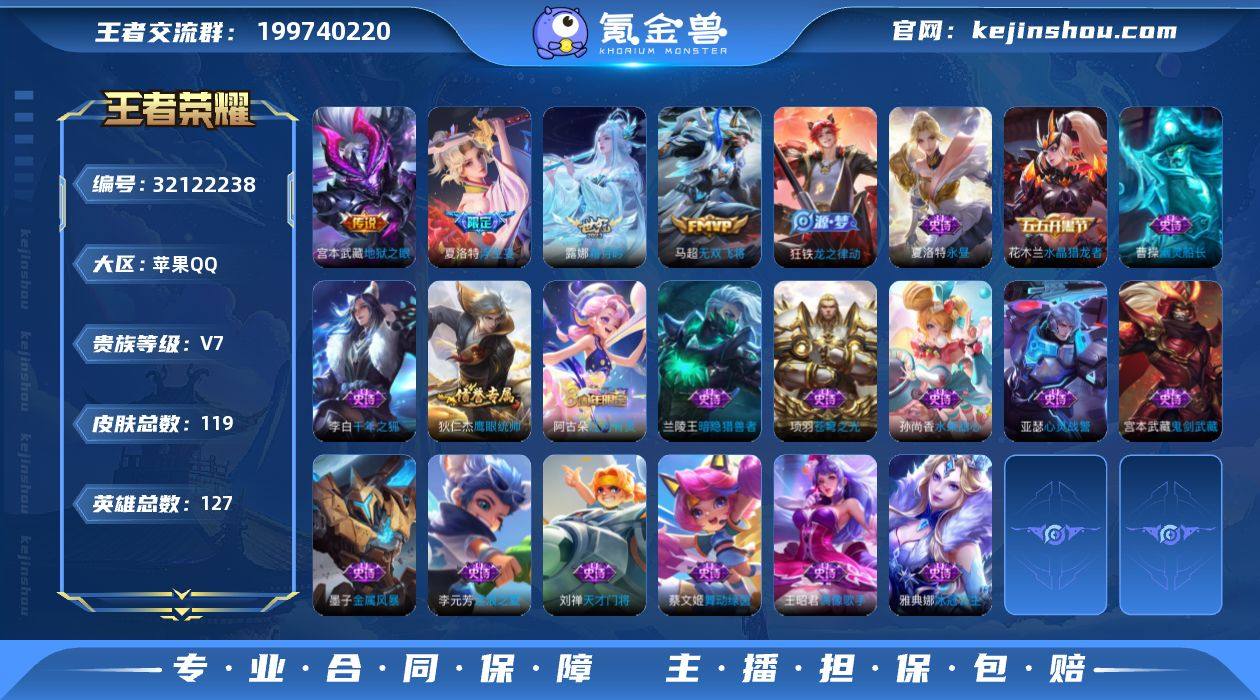 127英雄 119皮肤 可修改实名 男号 【英雄全皮】蚩奼全皮,夏洛特全皮,大禹全皮 【稀有英雄】大司命,嬴政(始皇帝),韩信(韩跳跳),夏洛特(夏师傅),艾琳,橘右京(橘子),娜可露露(鸟人),不知火舞,赵云,金蝉(唐僧),戈娅 【荣耀水晶】九霄神辉(木兰典藏) 【传说皮】地狱之眼,无双飞将,浮生妄,鹤归松栖(云缨),霜月吟 【珍宝阁皮】蔷薇恋人 【赛季/战令皮】古海寻踪(s33),海盐诗旅(s30),擒涛扼浪(s31),探海日志(s32),剑破天穹(s35),天穹祈灯(s34),大漠名商(s28),云中旅人(s29),超时空战士-钟无艳,落雪兰心 【史诗皮】线条小狗-周瑜,线条小狗-小乔,龙之律动,苍穹之光,千年之狐,永昼,江河有灵,高渐离燃音魔法,真我赫兹(百里守约),冰冠公主,偶像歌手,末日机甲-吕布,水果甜心,天才门将,暗隐猎兽者,幽灵船长,鬼剑武藏,心灵战警,舞动绿茵,逐浪之夏,水晶猎龙者,金属风暴,鹰眼统帅 【限定皮】鸣野蒿,五谷丰年,游园惊梦 【普通皮】雪境奇遇-西施,星梦巡礼,劲辣红锅,功夫炙烤,程咬金群星魔术团,暗都幽影,鹤鸣心笺,溯影追猎,班班快跑,极光幻客,聚星闪耀,太极少年,西部游侠,零食大作战,妄想特派,热血海滩,鬼谷子天穹祈灯(S34),破局者,幻夜行动,决胜大满贯,尼罗河女神,完美运算,暖冬絮语(程咬金),妲己灵卜魔法,胡桃狂想曲,蔚蓝守将,万事如意,花好人间,归虚梦演-孙膑,海滩派对,皇家上将,魔术师,守护之力,敏锐之力,化身博士,纽约教父,万象初新,黄金武士,天使之翼,功夫老勺,哥特玫瑰,西部大镖客(牛魔),教廷特使,阴阳师,汉昭烈帝,死亡骑士,少女阿狸,忍·炎影,丁香结,秘密基地,爱心护理,野性能量,冰雪圆舞曲,未来纪元-宫本武藏,玩偶对对碰,幻想奇妙夜,阿尔法小队,露花倒影,灼热之刃,剑舞者,踏雪寻梅,地府判官,埃及法老,维京掠夺者,激情绿茵,加勒比小姐,赤焰之缨,启蛰,创世神祝,街头旋风,花间舞,占星师,绝影神枪,天启骑士,木偶奇遇记,西部大镖客-...