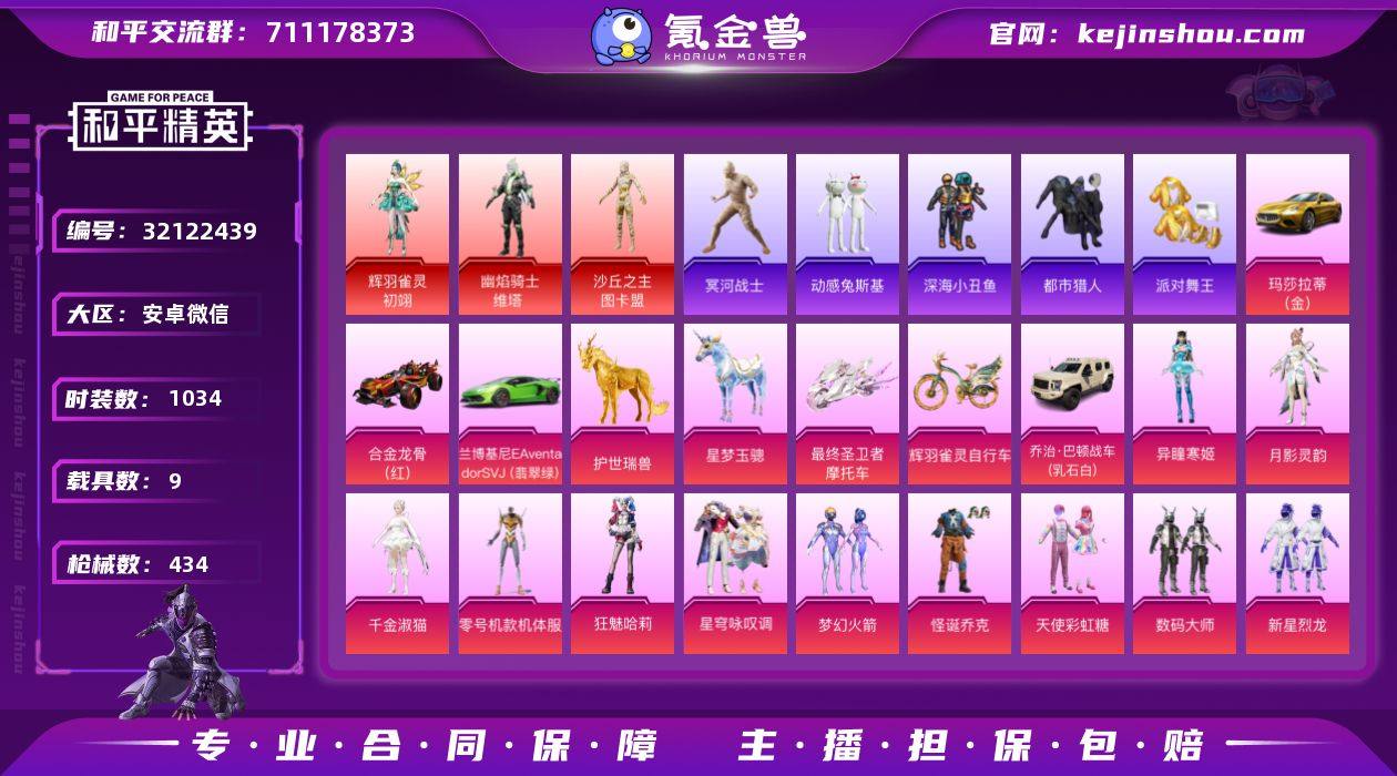 安卓微信-29王牌印记-有战神框-3红装-23粉装-32特效枪-9载具-热力值-287套装-434枪皮-5卓越印记-2传奇印记 【3红装】辉羽雀灵-初翊/2级,幽焰骑士-维塔/1级,沙丘之主-图卡盟/4级 【23粉装】套装-冰霜白皇,套装-甜心娃娃,套装-放客神游,套装-天使彩虹糖,套装-狩月元帅,角色-千金淑猫,角色-圣堂之誓,套装-彩虹鹿灵,套装-炙焰红王,套装-玉鳞金羽,角色-猩猩队长,套装-怪诞乔克,角色-狂魅哈莉,套装-新星烈龙,套装-梦幻火箭,角色-零号机款机体服,角色-月影灵韵,套装-金属狂野,套装-金风玉露,套装-数码大师,角色-异瞳寒姬,套装-星穹咏叹调,套装-筑梦精灵 【32特效枪】M762-激战未来/5级,MG3-辉羽雀灵/3级,SCAR-L-童趣迷兔/4级,Kar98K-圣域龙灵/1级,Vector-灵感创作师/5级,GROZA-香水柠檬/5级,GROZA-镜光银凌/4级,AKS-74U-信仰神谕/4级,M249-绝对恒星/2级,AKS-74U-森灵之息/1级,MK12-雪月幻音/5级,SCAR-L-金蛇镇世/3级,ACE32-萌骑漫游/5级,P90-沙丘之主/1级,Mk14-甜梦熊击/5级,平底锅-林间仙鹿/4级,DP-28-千金淑猫/2级,P90-仙履奇缘/7级,AUG-暖羊咩咩/5级,AMR-炫光之旅/4级,MG3-梦幻舞会/4级,破片手榴弹-热量炸弹/5级,烟雾弹-丁香清露/4级,Mk14-福马献瑞/3级,Kar98K-巳巳如意/5级,AKM-幽焰骑士/3级,UMP45-启明星/5级,M416-五爪金龙/1级,AUG-妙趣可丽/5级,M416-至情至圣/7级,M24-镜域双华/3级,AKM-甜心宝贝/7级 【13稀有紫装】冥河战士,都市猎人,派对舞王,萌熊伴侣背包(3级),暗影哥特,深海小丑鱼,浪漫天命,雪山精英,浪漫波比,明日香款战斗服,小丑鱼,龟仙人,零款战斗服 【9稀有载具】最终圣卫者摩托车,辉羽雀灵自行车,玛莎拉蒂Ghibli(金),乔治·巴顿战车(乳石白),兰博基尼Aventador SVJ(翡翠绿),合金龙