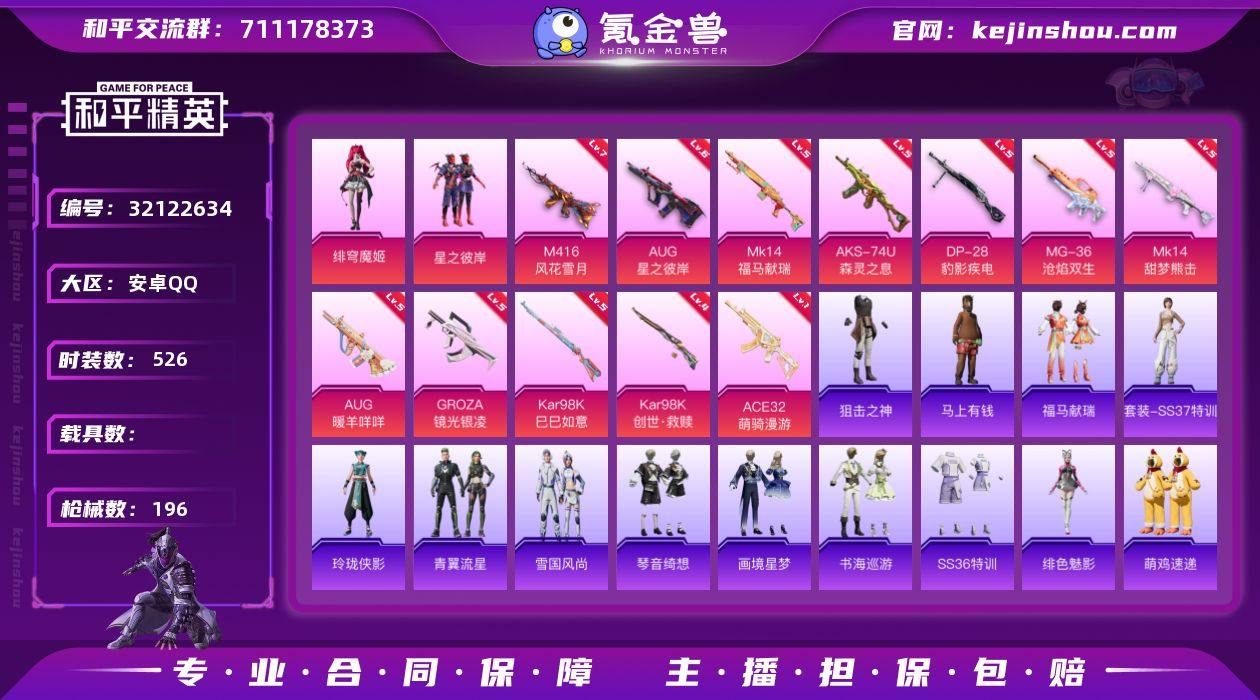 实名: 可修改 时装数: 526 枪械数: 196 战备数: 119 热门装扮: 鹰眼刺客,星之彼岸,绯穹魔姬 稀有枪皮: AUG星之彼岸,M416风花雪月,Kar98K创世·救赎,GROZA-镜光银凌,Kar98K-巳巳如意,AUG-暖羊咩咩,MK14-甜梦熊击,DP-28-豹影疾电,MG-36-沧焰双生,AKS-74U-森灵之息,ACE32-萌骑漫游