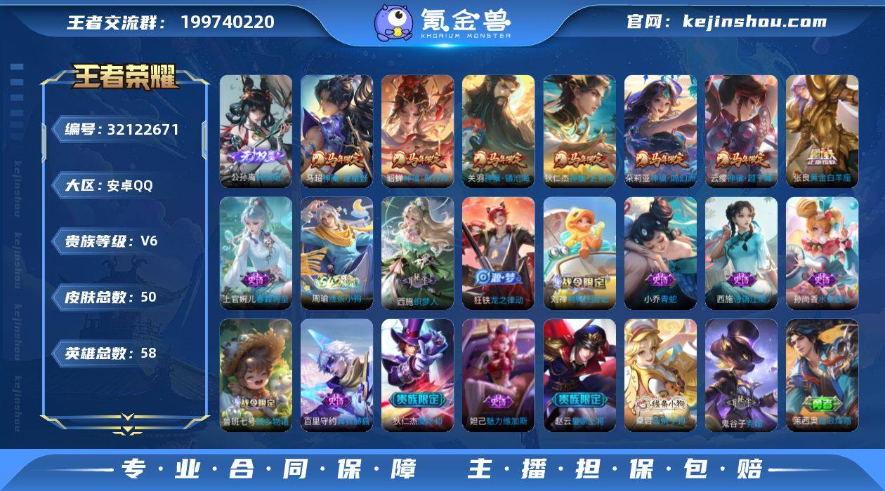 贵族等级:V6 典藏皮肤数:0 珍品无双皮肤数:0 无双皮肤数:1 珍品传说皮肤数:0 传说皮肤数:7 史诗皮肤数:12 皮肤数:50 英雄数:58 段位:钻石 卖家说:女号