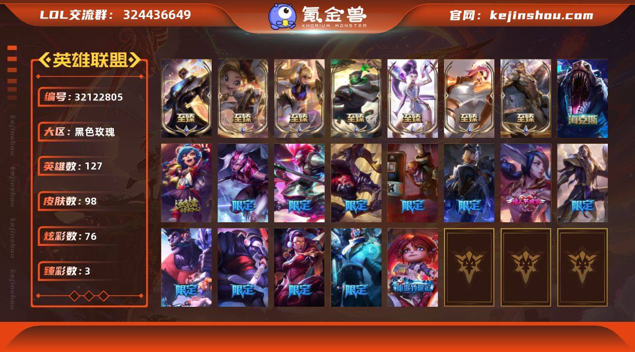 未定级段位-127英雄-98皮肤-76炫彩-0终极-10神话-12限定-14传说-16史诗 【神话皮肤】:十周年纪念安妮,神凰行者瑞羽圣凰艾尼维亚,海克斯科技雷克顿,至臻征服者贾克斯,至臻奥术师佐伊,至臻福牛守护者菲奥娜,至臻KDAALLOUT卡莎,至臻未来战士锤石,至臻源计划逆流塞拉斯,至臻战斗学院蕾欧娜 【热门头像】:爱情之歌头像 【至臻皮肤】:至臻征服者贾克斯,至臻战斗学院蕾欧娜,至臻福牛守护者菲奥娜,至臻奥术师佐伊,至臻KDAALLOUT卡莎,至臻未来战士锤石,至臻源计划逆流塞拉斯 【臻彩皮肤】:冠军掠夺者卡兹克凯旋圣装,冠军之刃锐雯2016凯旋圣装,弹幕天使卡莎炽天使勇敢 【海克斯皮肤】:海克斯科技雷克顿 【情人节限定】:甜心之羽霞 【冰雪限定】:圣诞玩偶波比 【限定皮肤】:冠军之血希瓦娜,暗杀星蒙多,暗杀星慎,SKTT1薇恩,SKTT1瑞兹,胜利枪神卢锡安,勇者奈德丽,电玩战魂赫卡里姆,都铎王朝图奇,防暴士兵辛吉德 【传说皮肤】:战场女武神凯尔,双重冰晶艾尼维亚,黯晶凤凰艾尼维亚,神拳李青,神龙尊者圣龙李青,第三类接触黑默丁格,战斗学院伊泽瑞尔,宇航员诺提勒斯,霸天异形卡兹克,神王德莱厄斯,奥德赛凯隐,西部魔影卢锡安,天煞劫,真实伤害艾克 【史诗皮肤】:摄魂男爵弗拉基米尔,战场公主希维尔,战争血统蒙多,掠星魔刃卡萨丁,霸天巨兽墨菲特,暗夜猫女卡特琳娜,沙漠风暴卡特琳娜,至高之拳李青,地下拳王李青,屠龙勇士薇恩,铁血猎手奈德丽,钢铁意志潘森,黑帮教父格雷福斯,银河魔装机神菲兹,黑帮狂花金克丝,霸天剑魔亚托克斯 【其他皮肤1】:西部魔影厄加特,五杀摇滚女声主唱凯尔,玉剑传说无极,黑暗骑士阿利斯塔,瑞兹白须,蕉泥座人索拉卡,星之守护者索拉卡,攻城巨兽努努和威朗普,勇敢的心艾希,梦魇泰达米尔,地狱火卡尔萨斯,王子不是我阿木木,联盟之喙艾尼...