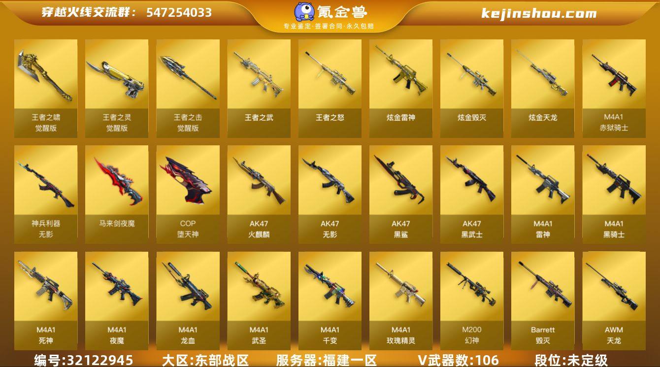 福建一区-117V-8王者武器数-7炫金武器数 【热门武器】:HK417-朱雀,M200-幻神,死亡之眼,荣耀世冠-火麒麟,荣耀世冠-雷神,荣耀世冠-柯尔特,Kar98K-星神,C.A.T,M4A1-黑骑士*2,汤姆逊-烈龙*6,RPK-盘龙,加特林-炼狱*3,火麒麟-绝迹,COP-堕天神*3,沙鹰-修罗*3,荣耀世冠-龙啸 【王者炫金武器】:王者之武,王者之怒,炫金骑士*2,炫金雷神,炫金武士,炫金毁灭*2,炫金天龙 【音效卡】:AK47-火麒麟音效卡,M4A1-雷神音效卡,M4A1-黑骑士音效卡,Barrett-毁灭音效卡,Barrett-极光音效卡,Barrett-碧霄极光音效卡*3 【皮肤】:幻神-冠军之幻,雷神-荣耀之魄,雷神-冠军之魄,雷神-传奇N9,火麒麟-雷神,火麒麟-冠军之心,毁灭耀金皮肤,毁灭-冠军之怒,毁灭-CFS2020,黑骑士耀金皮肤,战神-粉色甜心皮肤,战神-紫绶金章皮肤,战神-流金岁月皮肤,AWM-天龙-传奇70KG,AWM-天龙-传奇白鲨 【角色】:樱,瞳,魅影,凌霄,零·纪元,战地猎狐,奇洋探员,乔伊教练,修道士,云海玲珑,风暴女,嘉年华灵狐,潘多拉-X,潜龙队-X,青霞仙子,铁骑荣耀,雪莉杨,影武者-X,雅典娜 【人偶武器】:火麒麟-绝迹,AWM-灵狐-15周年嘉年华,海滩汪汪-巴雷特,M37-葵,C.A.T,迷你生化手雷,闪光弹-小乔 【暴走生化】:死亡之眼,超级对讲机 【英雄级武器】:M4A1-千变,AK47-火麒麟,M4A1-雷神*2,M4A1-黑骑士*2,AK47-无影*5,M4A1-死神,AK47-黑武士*5,M4A1-武圣,AK47-黑鲨*6,M4A1-龙血,HK417-朱雀,M4A1-夜魔,无影-神兵利器,M4A1-玫瑰精灵,9A91-烈火*3,王者之魄-觉醒版,AK-47-猩红传说*8,AK47-B-战神*2,荣耀世冠-火麒麟,荣耀世冠-雷神,AWM-天龙,Barrett-毁灭*5,AWM-裁决*4,M200-幻神,Kar98K-星神,RPK-盘龙,加特林-炼狱*3,炼狱-悦蓝-觉醒版,汤姆逊-烈龙