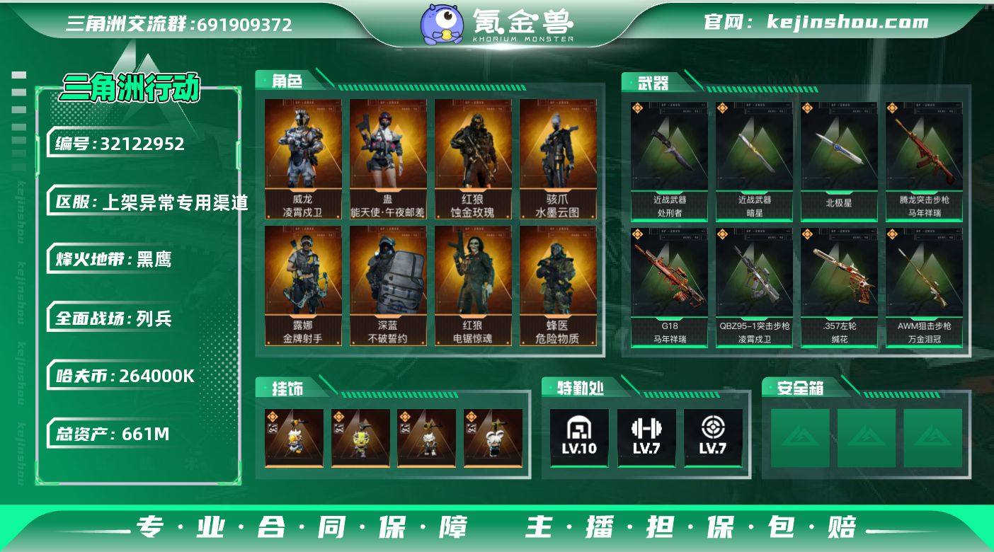 【总资产:661M+近战北极星+近战暗星+近战处刑者+红狼蚀金玫瑰+骇爪水墨云图+威龙凌霄戍卫+蛊午夜邮差+部门全4+仓库10+满体满负+S8赛季2x3+46AW子弹】/烽火等级:60级/全面战场:22级/纯币:302400K/三角券加币:164(三角币164+三角券0)【近战-北极星/近战-暗星/近战-处刑者】【红狼-蚀金玫瑰/骇爪-水墨云图/威龙-凌霄戍卫/蛊-午夜邮差】【红狼-电锯惊魂/深蓝-不破誓约/蜂医-无题密令/露娜-金牌射手】/部门:44444/特勤等级(技术中心3级/工作台3级/制药台3级/防具台3级/仓库10级/指挥中心5级/训练中心7级/靶场7级/潜水中心1级/收藏室1级)QBZ95-1突击步枪-凌霄戍卫/K437突击步枪-北极星/MK47突击步枪-暗星/橙色挂饰x14/段位:黑鹰