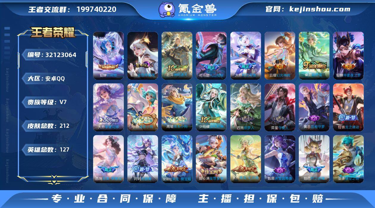 实名: 可修改 性别: 女号 贵族等级: V7 英雄数: 127 皮肤数: 212 荣耀水晶: 幻阙歌 星传说: 金色仲夏夜 传说皮: 仲夏夜之梦,挚爱花嫁,大乔-时之奇旅,幻光神枪,九山相柳,神树通天 限定皮: 遇见飞天,游园惊梦,幽恒,时之彼端,五谷丰年,至美·乘鲤谣,鸣野蒿