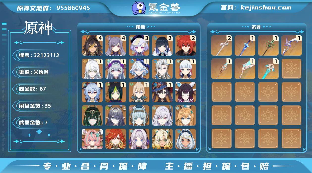 邮箱: 未绑定 总黄数: 67 冒险等级: 60 4命金色角色: 四命刻晴,四命迪希雅 3命金色角色: 三命七七 2命金色角色: 二命迪卢克,二命夜兰 1命金色角色: 一命神里绫华,一命莫娜,一命琴,一命甘雨,一命提纳里,一命那维莱特,一命芙宁娜,一命梦见月瑞希,一命兹白 0命金色角色: 枫原万叶,宵宫,钟离,雷电将军,八重神子,纳西妲,娜维娅,闲云,阿蕾奇诺,艾梅莉埃,玛拉妮,希诺宁,玛薇卡,茜特菈莉,瓦雷莎,爱可菲,丝柯克,伊涅芙,菈乌玛,奈芙尔,哥伦比娅 拥有武器: 天空之翼,和璞鸢,阿莫斯之弓,风鹰剑,天空之刃,天空之脊,波乱月白经津 2精武器: 风鹰剑 1精武器: 天空之翼,和璞鸢,阿莫斯之弓,天空之刃,天空之脊,波乱月白经津