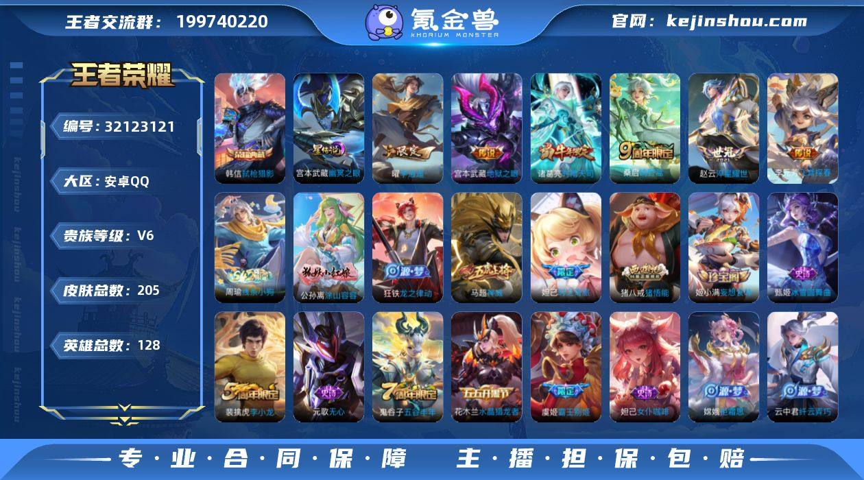 贵族等级:V6 典藏皮肤数:1 珍品无双皮肤数:0 无双皮肤数:0 珍品传说皮肤数:0 传说皮肤数:6 史诗皮肤数:52 皮肤数:205 英雄数:128 段位:星耀 卖家说:QQ账号等级皇冠,带妹的打野射手号,非常不错