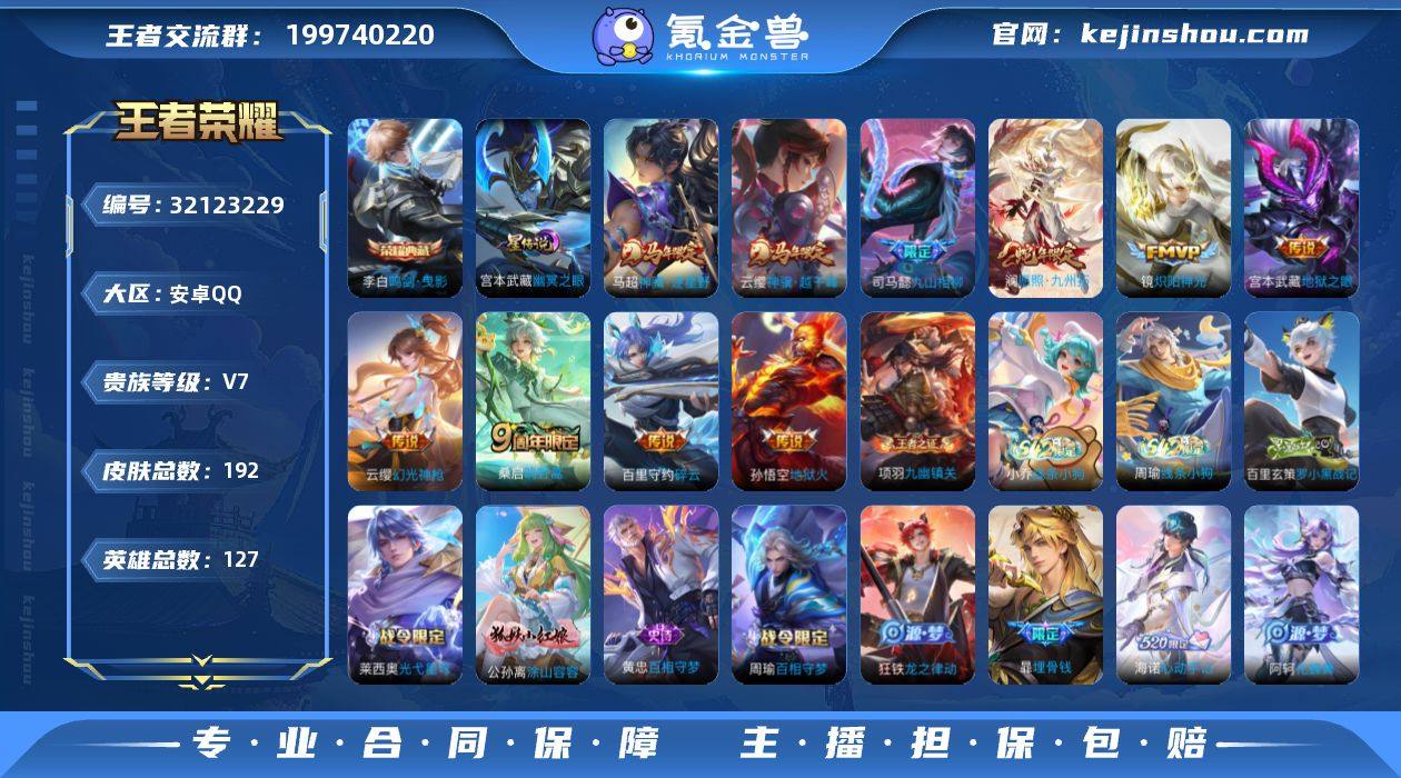 安卓Q-V7-最强王者段位-127英雄-192皮肤-1典藏皮肤-10传说-62史诗 【英雄全皮】:司马懿全皮,孙权全皮,戈娅全皮,海诺全皮 【荣耀典藏】:李白鸣剑曳影 【传说皮肤】:云缨神骥越千峰,马超神骥逐星野,司马懿九山相柳,澜愿照九州拓,云缨幻光神枪,桑启鸣野蒿,百里守约碎云,镜炽阳神光,宫本武藏地狱之眼,孙悟空地狱火 【限定皮肤】:暃埋骨钱,蒙犽顽岩魄,蔡文姬夏日便利店,虞姬夏日便利店,姜子牙天穹之誓,狄仁杰阴阳师,赵云皇家上将,元歌无心,马可波罗山海玄木吟,狄仁杰魔术师,项羽海滩派对,百里玄策原初追逐者,裴擒虎李小龙,裴擒虎擒涛扼浪,西施玲珑珍味,鲁班大师探海日志,桑启海盐诗旅,戈娅驭风魔法,阿古朵江河有灵,张良古海寻踪,鬼谷子天穹祈灯,姬小满妄想食味,刘邦剑破天穹,程咬金群星魔术团,镜青焰无极,项羽苍威无极,海诺心动手记,芈月浮光幕影,周瑜熔金海岸 【年限皮肤】:马可波罗山海玄木吟,澜愿照九州拓 【赛季限定】:桑启海盐诗旅,裴擒虎擒涛扼浪,鲁班大师探海日志,张良古海寻踪,鬼谷子天穹祈灯,刘邦剑破天穹,姜子牙天穹之誓,东皇太一噬灭天穹,太乙真人谧流熔炉,钟馗虚灵犬护,甄姬逆浪荇歌,亚瑟荣光之誓,百里玄策原初追逐者,牛魔星界战将,项羽九幽镇关 【战令限定】:戈娅驭风魔法,西施玲珑珍味,镜青焰无极,项羽苍威无极,蔡文姬夏日便利店,虞姬夏日便利店,亚连破空之剑,孙悟空神迹守卫,百里守约百相守梦,老夫子百相守梦,周瑜百相守梦,孙策百相守梦,莱西奥光弋星穹,明世隐往忆晖光,周瑜线条小狗,小乔线条小狗 【史诗皮肤】:周瑜线条小狗,小乔线条小狗,项羽九幽镇关,百里玄策罗小黑战记,莱西奥光弋星穹,公孙离涂山容容,黄忠百相守梦,周瑜百相守梦,狂铁龙之律动,阿轲化蝶舞,赵怀真器灵浮梦炉,弈星万物之道,牛魔星界战将...