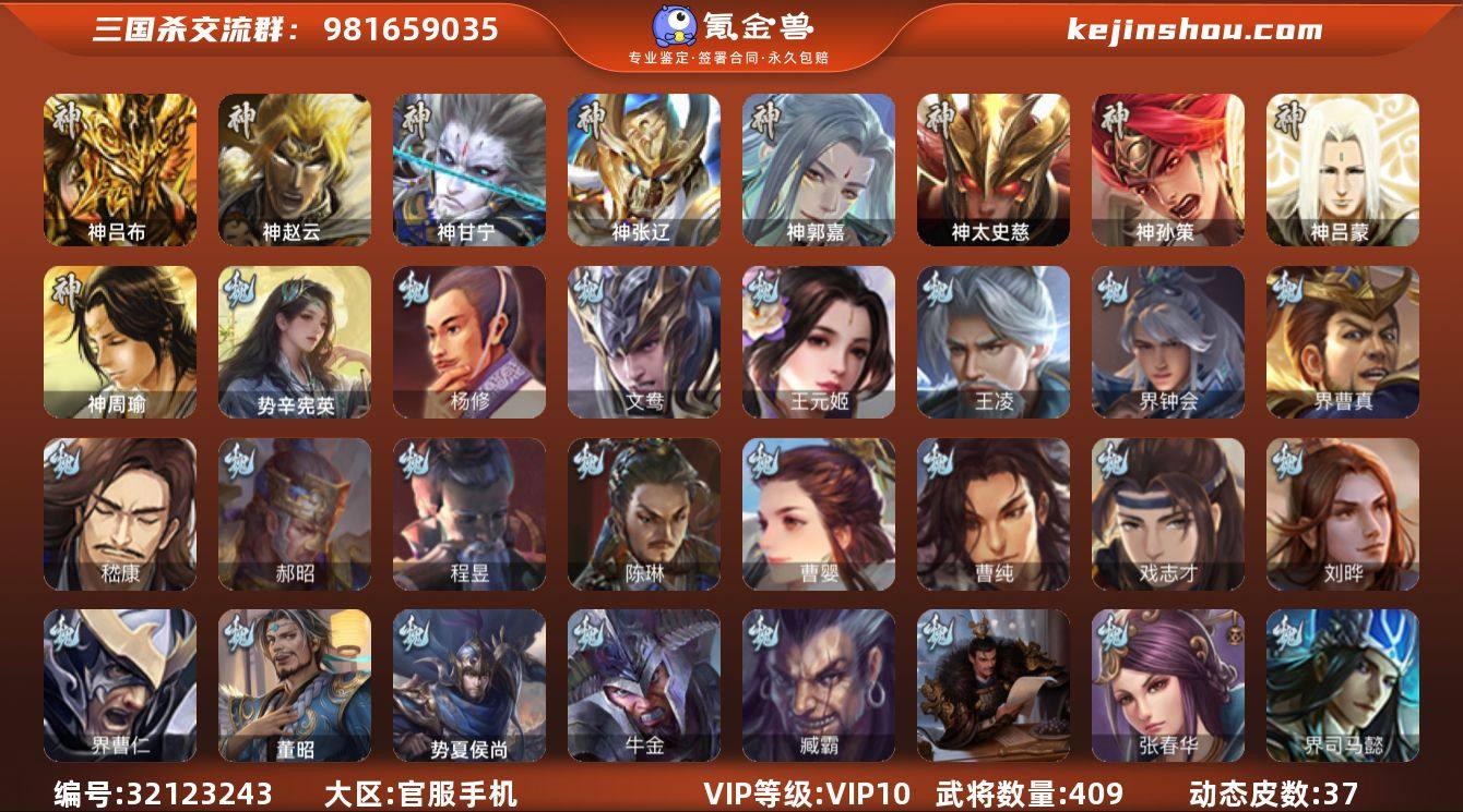 【3014】官阶:大将军;VIP等级:VIP10;史诗武将数量:56;动态皮肤数量:37;武将总数:409;史诗宝珠数量:0;将魂数量:2253;神将:7;魏国史诗武将:13;蜀国史诗武将:11;吴国史诗武将:10;群史诗武将:15 神吕布,神赵云,神甘宁,神张辽,神郭嘉,神太史慈,神孙策,杨修,王元姬,王凌,界钟会,界曹真,嵇康,郝昭,陈琳,曹婴,曹纯,戏志才,刘晔,势辛宪英,程昱,关索,马云騄,谋赵云,谋马超,赵襄,张星彩,王平,沙摩柯,谯周,界黄忠,董允,吴景,孙寒华,骆统,留赞,界朱然,界徐盛,界步练师,贺齐,文鸯,裴秀,左慈,张让,星黄忠,星甘宁,苏飞,审配,麹义,庞德公,祢衡,沮授,界左慈,杜预,许攸,兀突骨,神吕蒙,神周瑜,势夏侯尚,SP关羽,SP曹仁,SP蔡文姬,乐进,曹昂,诸葛诞,朱灵,文聘,SP姜维,张春华,钟会,曹冲,郭淮,满宠,界王异,界曹操,界司马懿,界夏侯惇,界张辽,界许褚,界郭嘉,李典,曹真,韩浩史涣,陈群,曹叡,曹休,钟繇,司马朗,王基,李通,郭皇后,孙资刘放,辛宪英,界甄姬,吕虔,鲁芝,界典韦,界荀彧,界徐晃,杜畿,界曹丕,界邓艾,张恭,界曹植,界曹彰,界满宠,界郭淮,卞夫人,界陈群,华歆,蔡贞姬,袁涣,王双,崔琰,毛玠,阮慧,谋徐晃,胡班,牛金,界夏侯渊,界曹仁,臧霸,唐咨,董昭,势陈到,SP孙尚香,关银屏,夏侯霸,马良,关兴张苞,廖化,界马岱,关平,简雍,刘封,界法正,界关兴张苞,界刘备,界关羽,界张飞,界赵云,界马超,SP徐庶,吴懿,周仓,张松,刘谌,夏侯氏,糜竺,马忠,孙乾,李严,黄皓,吴苋,秦宓,界黄月英,界诸葛亮,赵统赵广,严颜,界伊籍,界卧龙诸葛,界庞统,界孟获,界祝融,陈到,界姜维,界刘禅,吕凯,张翼,杨仪,邓芝,傅肜,费祎,糜夫人,界周仓,许靖,向宠,界吴懿,彭羕,谋庞统,界张嶷,谋张飞,吴班,霍峻,诸葛果,界魏延,蒋琬费祎,糜芳傅士仁,甘夫人,鲁肃,孙茹,凌操,大乔小乔,诸葛恪,诸葛瑾,孙鲁育,程普,韩当,潘璋马忠,虞翻,朱然,界周泰,界甘宁,界吕蒙,界黄盖,界周瑜,界大乔,界陆逊,...