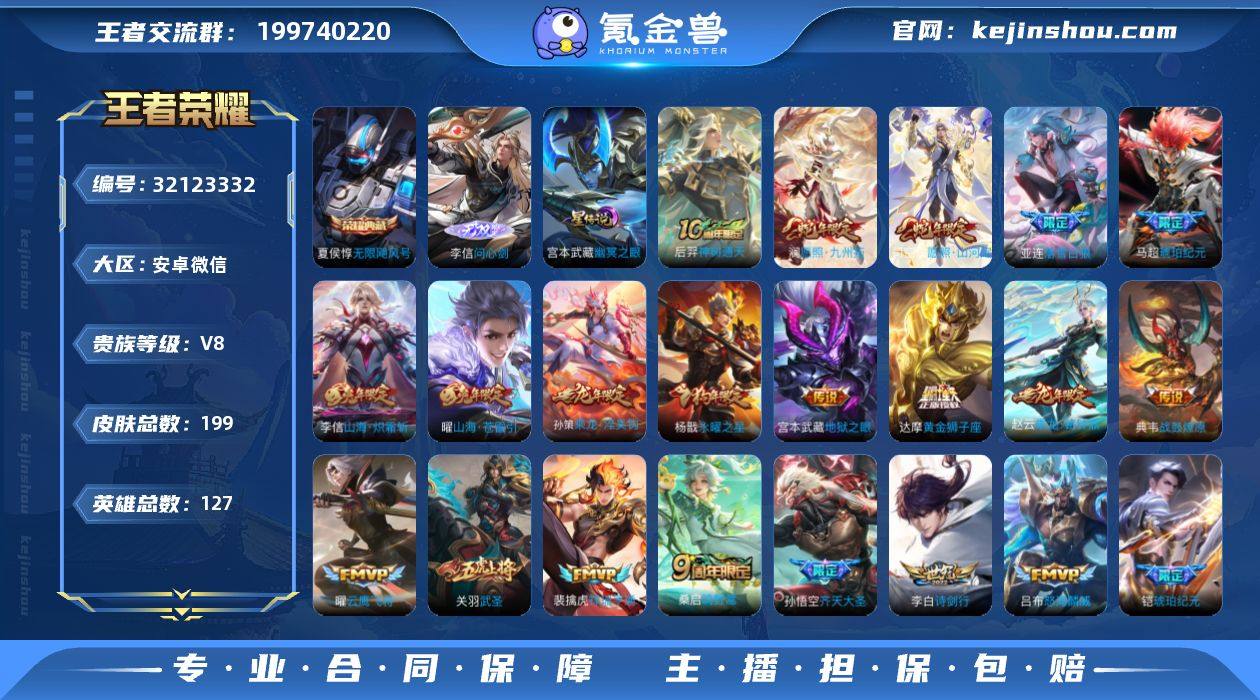李信新无双!安卓WX-V8-至尊星耀IV段位-127英雄-199皮肤-1典藏皮肤-1无双-25传说-47史诗 【英雄全皮】:敖隐全皮,空空儿全皮 【荣耀典藏】:夏侯惇无限飓风号 【无双皮肤】:李信问心剑 【传说皮肤】:后羿神树通天,司空震愿照山河定,澜愿照九州拓,裴擒虎祥瑞亨通,桑启鸣野蒿,亚连落雪白狼,典韦战鼓燎原,孙策乘龙淬吴钩,赵云乘龙铭钟鼎,马超琥珀纪元,铠琥珀纪元,孙悟空齐天大圣,曜山海苍雷引,李信山海炽霜斩,吕布怒海麟威,李白诗剑行,铠绛天战甲,虞姬启明星使,关羽武圣,曜云鹰飞将,张良黄金白羊座,虞姬云霓雀翎,达摩黄金狮子座,杨戬永曜之星,宫本武藏地狱之眼 【限定皮肤】:姜子牙天穹之誓,狄仁杰阴阳师,赵云皇家上将,赵云引擎之心,孙尚香蔷薇恋人,元歌无心,甄姬落雪兰心,典韦岱宗,马可波罗山海玄木吟,狄仁杰魔术师,项羽海滩派对,关羽武圣,韩信飞衡,韩信傲雪梅枪,孙悟空齐天大圣,后羿辉光之辰,李元芳云中旅人,虞姬启明星使,杨戬永曜之星,杨戬潮玩骑兵,沈梦溪星空之诺,裴擒虎擒涛扼浪,李信山海炽霜斩,嫦娥暖冬兔眠,曜山海苍雷引,西施玲珑珍味,鲁班大师探海日志,桑启海盐诗旅,暃星界游侠,戈娅驭风魔法,张良古海寻踪,蒙恬荣光圣徽,高渐离燃音魔法,妲己灵卜魔法,鬼谷子天穹祈灯,铠琥珀纪元,马超琥珀纪元,孙策乘龙淬吴钩,赵云乘龙铭钟鼎,亚连落雪白狼 【年限皮肤】:杨戬永曜之星,后羿辉光之辰,典韦岱宗,韩信飞衡,曜山海苍雷引,李信山海炽霜斩,马可波罗山海玄木吟,孙策乘龙淬吴钩,赵云乘龙铭钟鼎,司空震愿照山河定,澜愿照九州拓 【赛季限定】:李元芳云中旅人,桑启海盐诗旅,裴擒虎擒涛扼浪,鲁班大师探海日志,张良古海寻踪,鬼谷子天穹祈灯,姜子牙天穹之誓,东皇太一噬灭天穹,太乙真人谧流熔炉,钟馗虚灵犬护,甄姬逆浪荇歌,亚瑟荣...