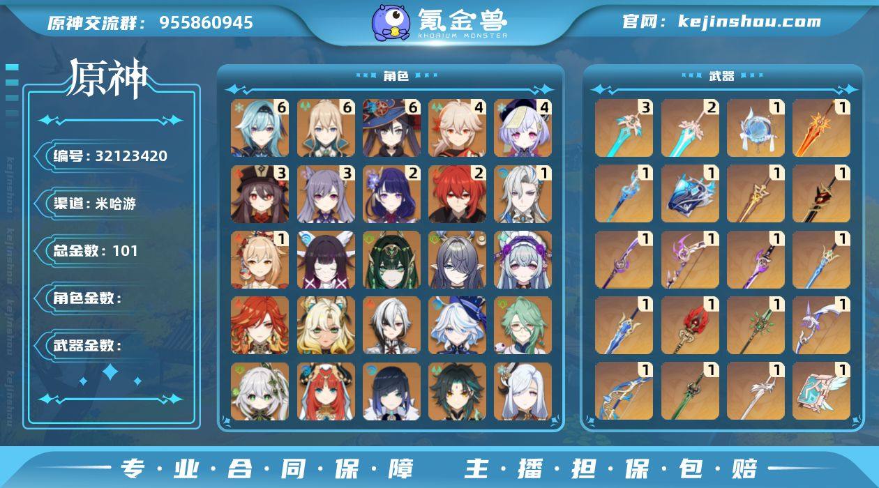 【原神】满命,冒险等级:60,五星数量:60,五星角色:莫娜 * 6命,琴 * 6命,优菈 * 6命,枫原万叶 * 4命,七七 * 4命,胡桃 * 3命,刻晴 * 3命,迪卢克 * 2命,雷电将军 * 2命,那维莱特 * 1命,宵宫 * 1命,希诺宁,白术,神里绫华,温迪,玛薇卡,迪希雅,钟离,荒泷一斗,达达利亚,梦见月瑞希,申鹤,阿贝多,夜兰,芙宁娜,提纳里,阿蕾奇诺,妮露,纳西妲,菈乌玛,奈芙尔,哥伦比娅,甘雨,魈__五星武器:天空之刃 * 3精,天空之傲 * 2精,焚曜千阳,万世流涌大典,静水流涌之辉,阿莫斯之弓,帷间夜曲,苍古自由之誓,飞雷之弦振,风鹰剑,和璞鸢,护摩之杖,磐岩结绿,四风原典,松籁响起之时,天空之脊,天空之卷,天空之翼,雾切之回光,薙草之稻光,终末嗟叹之诗,赤角石溃杵,圣显之钥__四星角色:班尼特 * 6命,行秋 * 6命,九条裟罗 * 6命,香菱 * 6命,久岐忍 * 6命,凝光 * 6命,迪奥娜 * 6命,砂糖 * 6命,芭芭拉 * 6命,云堇 * 6命,早柚 * 6命,托马 * 6命,五郎 * 6命,烟绯 * 6命,重云 * 6命,辛焱 * 6命,诺艾尔 * 6命,罗莎莉亚 * 6命,雷泽 * 6命,菲谢尔 * 6命,北斗 * 6命,鹿野院平藏 * 5命,柯莱 * 5命,卡齐娜 * 4命,珐露珊 * 3命,多莉 * 3命,欧洛伦 * 3命,赛索斯 * 3命,绮良良 * 2命,菲米尼 * 2命,夏沃蕾 * 2命,嘉明 * 2命,瑶瑶 * 1命,琳妮特 * 1命,伊法 * 1命,爱诺 * 1命,埃洛伊,奇偶·女性,奇偶·男性,坎蒂丝,蓝砚,夏洛蒂,月绽放战舰