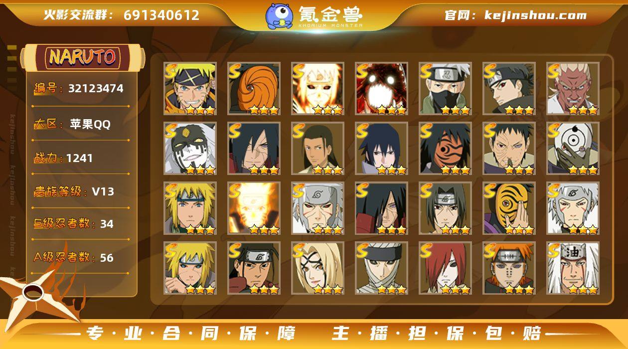 区服:588区 实名:不可二次实名 贵族等级:V11 战力值:10388535 S忍数:23 A忍数:37 三星宇智波斑「五影会谈」,三星漩涡鸣人「暴怒·第六尾」,三星大筒木舍人「最终章」,三星旗木卡卡西「须佐能乎」,三星宇智波止水「须佐能乎」,三星宇智波佐助「永恒万花筒」,三星神秘面具男「红夜之刃」,三星宇智波带土「忍界大战」,三星宇智波斑「白面具」,三星波风水门,三星佩恩·天道「超」,三星漩涡鸣人「九喇嘛连结」,三星迈特凯「死门」,三星千手扉间「秽土转生」,三星宇智波鼬「须佐能乎」,三星千手柱间「秽土转生」,三星猿飞日斩「秽土转生」,三星纲手「百豪」,三星佩恩「天道」,三星春野樱「忍界大战」,三星大筒木金式「博人传」,三星自来也「舞之豪杰」,三星大蛇丸 五星干柿鬼鲛,五星猿飞阿斯玛,五星迈特凯,三星飞段,三星我爱罗「疾风传」,三星蝎,二星迈特凯「青春爆炸」,二星巳月「仙人模式」,二星宇智波佐助「侠隐江湖」,二星机械鸣人「初始形态」,二星桃地再不斩「秽土转生」,二星神农「羁绊」,二星宇智波带土「漂泊浪客」,二星宇智波泉奈,二星角都「秽土转生」,二星李洛克「忍界大战」,二星漩涡博人「桃式显现」,二星长十郎「六代目水影」,二星长门「青年」,二星艾「青年」,二星达鲁伊「五代目雷影」,二星神秘面具男「忍者之路」,二星波风水门「青年」,二星旗木卡卡西「元气夏日」,二星黑土「博人传」,二星宇智波佐助「须佐能乎」,二星千代「近松十人卫」,二星秋道丁次「忍界大战」,二星波风水门「新春限定」,二星宇智波佐助「万花筒写轮眼」,二星志村团藏,二星奇拉比,二星飞段「死司凭血」,二星迪达拉,二星宇智波鼬,二星桃地再不斩,二星卑留呼「火之意志继承者」 卖家说:金水80片 传自71片 忍雷41 小胡子40左右
