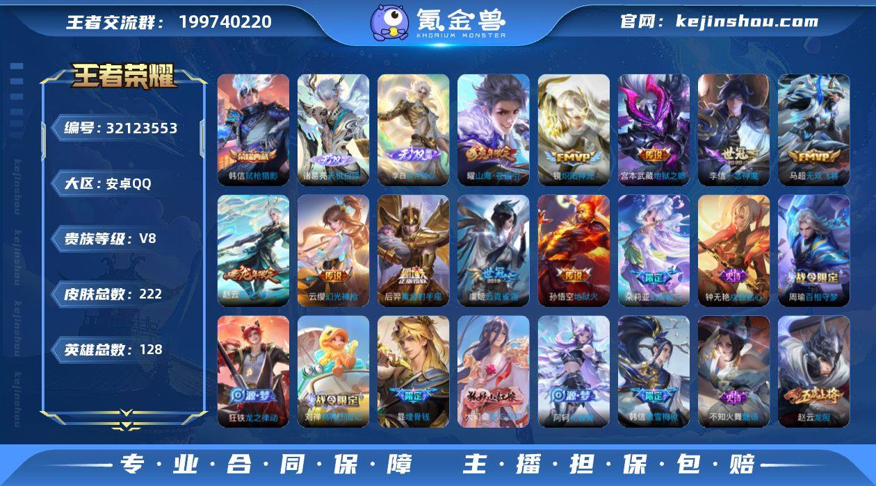 18传说 128英雄 222皮肤 可修改实名 女号 【英雄全皮】敖隐全皮,大禹全皮 【稀有英雄】敖隐(小龙人),大司命,嬴政(始皇帝),韩信(韩跳跳),夏洛特(夏师傅),艾琳,橘右京(橘子),娜可露露(鸟人),不知火舞,赵云,金蝉(唐僧),戈娅 【荣耀水晶】弑枪猎影(韩信典藏) 【无双皮】神罪,天机白泽,碎月剑心(李白无双) 【传说皮】神骥·越千峰,乘龙·铭钟鼎(赵云年限),幻光神枪,踏浪归,黄金射手座,地狱火,地狱之眼,云霓雀翎,一念神魔,炽阳神光,无双飞将,山海·苍雷引(电光曜子),澜逐花归海 【珍宝阁皮】锁墨魂,玩趣恶龙 【赛季/战令皮】噬灭天穹(s37),古海寻踪(s33),海盐诗旅(s30),擒涛扼浪(s31),探海日志(s32),玲珑珍味,流音漫舞,剑破天穹(s35),天穹祈灯(s34),驱傩正仪(s24),千军破阵(s25),胡桃异想国,沙漠行僧(s26),金庭之子(s27),大漠名商(s28),云中旅人(s29) 【史诗皮】百晓客,赞萌露比,茶境仙,东方月初,埋骨钱,化蝶舞,线条小狗-周瑜,线条小狗-小乔,鸭鸭历险记-刘禅,傩神司,光弋星穹,守夜人,百相守梦-周瑜,龙之律动,戍鼓铭心,百相守梦-黄忠,幻珠鲛人,紫霞仙子,白龙吟,特工魅影,完美假期,冰冠公主,偶像歌手,魅语,末日机甲-吕布,时之恋人-孙尚香,节奏热浪,摇滚巨星,天才门将,德古拉伯爵,幽灵船长,鬼剑武藏,暗渊魔法,乐园奇幻夜,缤纷独角兽,乘风破浪,逐浪之夏,水晶猎龙者,曙光守护者,圣诞狂欢,圣诞恋歌,鹰眼统帅,魅力维加斯,雪上飞焰,赏金猎手,顽趣-阿古朵,无心,未来纪元-赵云 【限定皮】愿照·九州拓(澜年限),逐霄战戟,鸣野蒿,白虎志(电光耗子),傲雪梅枪,诗剑行,五谷丰年,梁祝,龙胆 【普通皮】舞狮寰,赤刃凌霄,谧流熔炉,怪诞之夜,雾都夜雨,访茗客,铁骨偃魂,苍林狼骑,雪境奇遇-西施,星梦巡礼,玫蓝誓约,功夫炙烤,街头霸王,朵莉亚金色潮汐,蔬乡物语(李元芳),熔金海岸,暗都幽影,景韶洛都,浪漫序章,虚灵犬护,荣光之誓,往忆晖光,鹤鸣心笺,...