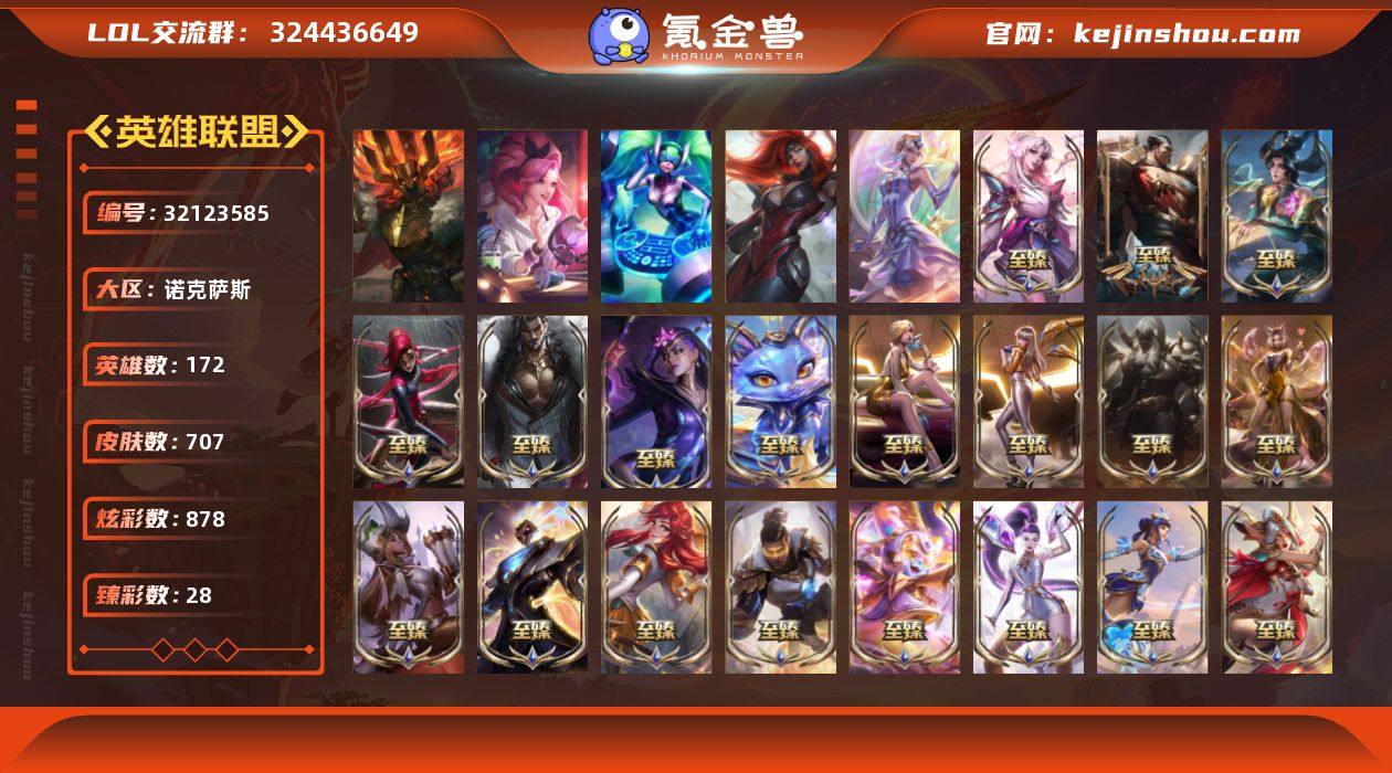 【圣堂铁男 金鱼莲花阿狸】未定级段位-172英雄-707皮肤-878炫彩-6终极-45神话-94限定-58传说-100史诗 【圣堂皮肤】:萨恩乌祖尔莫德凯撒 【神话皮肤】:十周年纪念安妮,源代码乐芙兰,殿堂传奇乐芙兰,十五周年纪念希维尔,神凰行者瑞羽圣凰艾尼维亚,黎明使者卡尔玛,殿堂传奇薇恩,灰烬骑士莫德凯撒,水晶圣骑蕾欧娜,金鱼枫姬莲华温泉阿狸,圣洁神王德莱厄斯,恐惧新星德莱厄斯,至臻斗魂觉醒萨科,至臻海珀利安小队X09星环灵风迦娜,至臻海之歌萨勒芬妮,至臻幻灵战斗猫金克丝,至臻魂蔷薇烈娜塔,至臻剪纸仙灵希维尔,至臻绝息圣堂厄运小姐,至臻KDA阿狸,至臻KDAALLOUT卡莎,至臻KDA卡莎,至臻KDA伊芙琳,至臻魅惑女巫厄运小姐,至臻青花瓷拉克丝,至臻神凰行者烈羽焰凰霞,至臻太空律动节奏幻师璐璐,至臻太空律动魔音海妖娜美,至臻未来战士锤石,至臻未来战士卢锡安,至臻腥红之月亚托克斯,至臻腥红之月亚托克斯2022,至臻星之守护者妮蔻,至臻星之守护者索拉卡,至臻月蚀骑士赛娜,至臻玉剑传说琴仙子,至臻战斗学院拉克丝 【热门头像】:爱意绵绵头像,觅心之翼奎因头像,银河魔装机神安妮头像,玉剑传说苍鸾头像,星守索拉卡头像 【至臻皮肤】:至臻剪纸仙灵希维尔,至臻星之守护者索拉卡,至臻魅惑女巫厄运小姐,至臻绝息圣堂厄运小姐,至臻KDA伊芙琳,至臻斗魂觉醒萨科,至臻玉剑传说琴仙子娑娜,至臻海珀利安小队X09星环灵风迦娜,至臻狼神英灵斯维因,至臻黑色玫瑰假面舞会卡特琳娜,至臻剪纸仙灵卡西奥佩娅,至臻战斗学院拉克丝,至臻青花瓷拉克丝,至臻灵魂莲华拉克丝,至臻KDA阿狸,至臻太空律动节奏幻师璐璐,至臻凯旋将军德莱厄斯,至臻暗星女王黛安娜,至臻KDA卡莎,至臻KDAALLOUT卡莎,至臻海之歌萨勒芬妮,至臻幻灵战斗猫金克丝,至臻月蚀骑士赛娜,至臻未来战士卢锡安,至臻灵魂莲华劫...