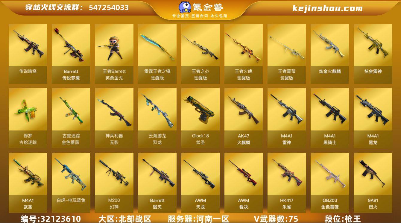 河南一区-86V-7王者武器数-2炫金武器数 【传说武器】:传说暗裔,传说梦魇 【热门武器】:传说暗裔,传说梦魇,QBZ03-金色蔷薇,HK417-朱雀,M4A1-青龙,M200-幻神,金色蔷薇-古蛇迷踪,修罗-古蛇迷踪,M200-竞技荣光,死亡之眼,白虎-电玩蓝兔,Cat-刀锋,炼狱-迷你小钢,M4A1-黑骑士,汤姆逊-烈龙*6,RPK-盘龙*6,加特林-炼狱,毁灭-孙三炮,USP-雷暴,沙鹰-修罗*7 【王者炫金武器】:炫金火麒麟,炫金雷神 【音效卡】:AK47-火麒麟音效卡,M4A1-黑骑士音效卡 【皮肤】:QBZ03-巅峰荣耀皮肤,雷神-暗月*2,雷神-宠儿-2019MVP,雷神-维纳斯皮肤,雷神-动感闪耀 皮肤,火麒麟-雷神,毁灭-冠军之怒,毁灭-战神张飞,毁灭-BEAN-2020MVP,毁灭-风暴*2,毁灭-魔灵皮肤,M4A1-千变-孔明皮肤,黑龙-墨子皮肤,黑骑士-暗月,战神-粉色甜心皮肤,AK47-B-常胜将军-刘备,AK47-B-常胜将军-孙权,炼狱-月 皮肤,擎天-蒸汽钟表 皮肤,麒麟刺-月皮肤 【角色】:葵,魅影,电竞教官-云悠悠,月兔特工,兰-巾帼英雄,司雨,王者零-华冠丽服,王者-零-国色天香,王者-魅影,蛇隐宗,乔伊教练,修道士,云海玲珑,暗夜-X,初恋灵狐,芳心审判者,风暴女,嘉年华灵狐,猎狐者-追月,灵狐者-X,灵狐者-七夕宝贝,龙儿,麻雀,曼陀罗-X,潘多拉-X,青霞仙子,蛇姬,铁骑荣耀,兔囡囡,职业选手 【人偶武器】:毁灭-孙三炮,白虎-迷你小艾,天龙-曼陀罗,王者Barrett-英勇金戈,M4A1-雷神-精英刀锋,炼狱-迷你小钢,巴雷特-零-水下丽影*2,Barrett-云海玲珑,AWM-灵狐-15周年嘉年华,Cat-刀锋,迷你裂空之翼*6,迷你牛魔王,迷你波特博士*16,迷你曼提柯尔,迷你牛牛,迷你火种*12,生化手雷-机甲核心*2,深渊终结者手雷,迷你艾比,迷你超能女侍,沙鹰-夜玫瑰 【暴走生化】:死亡之眼 【挑战大师】:神圣爆裂者III,AK47-冰龙粉碎者,...