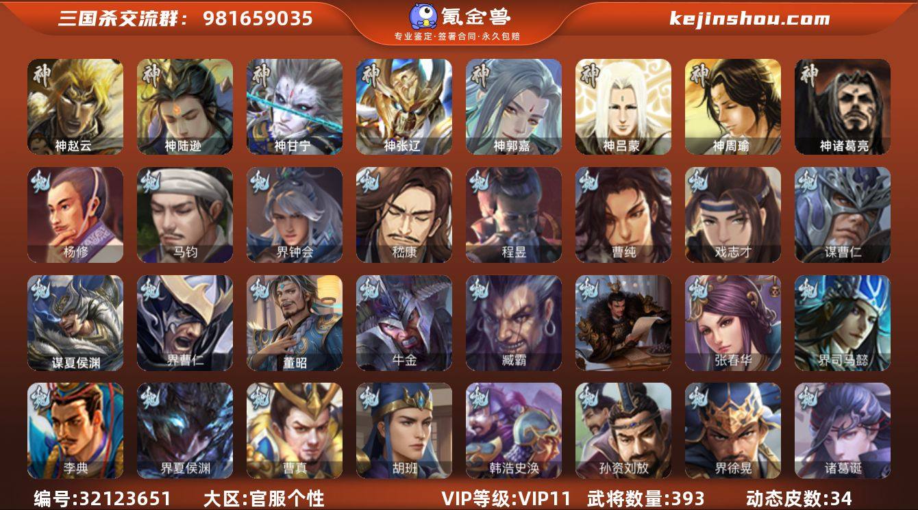 【3046】官阶:大将军;VIP等级:VIP11;史诗武将数量:44;动态皮肤数量:34;武将总数:393;史诗宝珠数量:0;将魂数量:4687;神将:6;魏国史诗武将:24;蜀国史诗武将:7;吴国史诗武将:7;群史诗武将:17 神赵云,神陆逊,神甘宁,神张辽,神郭嘉,神诸葛亮,谋曹仁,杨修,马钧,界钟会,嵇康,曹纯,戏志才,程昱,谋诸葛亮,马云騄,赵襄,张星彩,王平,沙摩柯,谯周,吴景,骆统,留赞,界朱然,界徐盛,界步练师,贺齐,裴秀,左慈,张让,徐荣,星黄忠,苏飞,麹义,祢衡,刘焉,沮授,界左慈,公孙康,杜预,卑弥呼,许攸,兀突骨,士燮,神吕蒙,神周瑜,SP关羽,SP曹仁,SP蔡文姬,乐进,曹昂,诸葛诞,朱灵,文聘,SP姜维,张春华,钟会,曹冲,郭淮,满宠,界王异,界曹操,界司马懿,界夏侯惇,界张辽,界许褚,界郭嘉,李典,曹真,韩浩史涣,陈群,曹叡,曹休,钟繇,司马朗,王基,李通,郭皇后,孙资刘放,辛宪英,界甄姬,吕虔,鲁芝,蒯越蒯良,界典韦,界荀彧,界徐晃,杜畿,界曹丕,毌丘俭,界邓艾,张恭,贾逵,界曹植,界曹彰,界满宠,界郭淮,卞夫人,辛毗,界陈群,华歆,蔡贞姬,袁涣,崔琰,谋徐晃,谋于禁,界曹休,胡班,谋夏侯渊,牛金,界夏侯渊,界曹仁,臧霸,唐咨,董昭,SP孙尚香,关银屏,夏侯霸,马良,关兴张苞,廖化,界马岱,关平,简雍,刘封,界法正,界关兴张苞,界刘备,界关羽,界张飞,界赵云,界马超,SP徐庶,吴懿,周仓,张松,刘谌,夏侯氏,糜竺,马忠,孙乾,李严,黄皓,吴苋,秦宓,界黄月英,界诸葛亮,严颜,界伊籍,界卧龙诸葛,界庞统,界孟获,界祝融,陈到,界姜维,界刘禅,吕凯,张翼,杨仪,邓芝,傅肜,界简雍,陈震,费祎,糜夫人,界周仓,许靖,向宠,刘巴,谋庞统,界张嶷,谋张飞,霍峻,诸葛果,界魏延,蒋琬费祎,糜芳傅士仁,甘夫人,鲁肃,孙茹,凌操,大乔小乔,诸葛恪,诸葛瑾,孙鲁育,程普,韩当,潘璋马忠,虞翻,朱然,界周泰,界甘宁,界吕蒙,界黄盖,界周瑜,界大乔,界陆逊,孙鲁班,朱桓,顾雍,孙休,朱治,全琮,步骘,阚泽,孙登,岑昏,徐氏,薛...