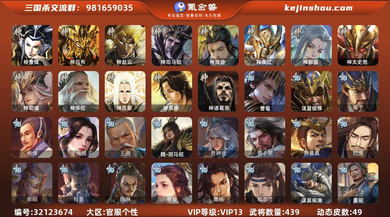 VIP等级:VIP13 官阶:大将军 史诗武将数量:69 动态皮肤数量:49 宝珠数量:0 元宝数量:2027 将魂数量:6274 雁翎数量:46785 心愿积分数量:11334 欢乐豆数量:4800 金票数量:22264 卖家说:动态神郭嘉动态神荀彧动态神曹操动态刘焉友诸葛亮动态十常侍神司马懿曹髦双形态文鸯势太史慈谋貂蝉孙寒华谋黄忠谋关羽谋诸葛亮双形态杜预神华佗势陆郁生司马昭神太史慈神陆逊王元姬曹婴王朗界徐盛骆统周处双形态界钟会