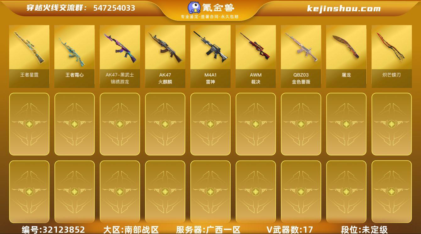 广西一区-19V-3王者武器数-0炫金武器数 【热门武器】:QBZ03-金色蔷薇,炽芒蝶刃 【王者炫金武器】:王者霜心,王者星霆 【皮肤】:裁决-运输船 皮肤,屠龙-星火燎原 【角色】:乔伊教练,云海玲珑,暗夜-X,电竞少女,嘉年华灵狐,兰妹妹,猎狐者-追月,0号玩家,潘多拉-X,潜龙队-X,维纳斯 【人偶武器】:生化手雷-机甲核心 【英雄级武器】:AK47-火麒麟,M4A1-雷神,黑武士-锦绣游龙,QBZ03-金色蔷薇,机械迷城-穹宇,AWM-裁决,Barrett-金色蔷薇,屠龙,炽芒蝶刃,丛林匕首-玄豹,高爆手雷-云龙,高爆手雷-雷霆王者-觉醒版,闪光弹-云龙*2,烟雾弹-云龙*2,M4A1-苍鸣雷神 【道具】:云山科技背包,女皇终结者-魔龙之吻,绿色巨人,生化弹匣,夺命之镰,防化服*2,枪王排位28赛季金色流光,防弹头盔*3,防弹衣*3,C4工具钳*2,手雷包*2 【特殊枪械】: