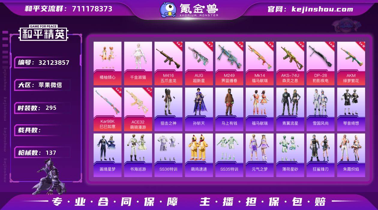 实名: 可修改 时装数: 295 枪械数: 137 热门装扮: 橘柚倾心,千金淑猫 稀有枪皮: M416五爪金龙,AUG超新星,AKM绿萝繁花,Kar98K-巳巳如意,DP-28-豹影疾电,M249-霁蓝缠春,AKS-74U-森灵之息,MK14-福马献瑞,ACE32-萌骑漫游 亮点: 【优质装备】:七级AUG-超新星,七级M416-五爪金龙