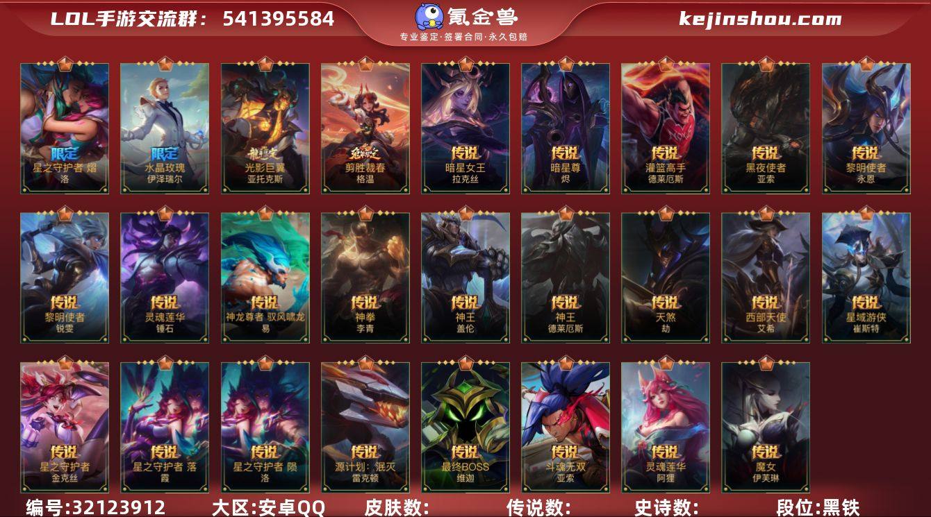 1神话 5限定 27传说 55史诗 126皮肤 可二次 可修改实名 【段位】翡翠 【神话皮】天命豪侠 瑟提 【限定皮肤】赵云子龙,星之守护者霞,星之守护者洛,水晶玫瑰伊泽瑞尔,水晶玫瑰永恩 【传说皮】暗星尊,光影巨翼亚托克斯,魔女伊芙琳,灵魂莲华阿狸,神龙尊者 昼日真龙 亚索,西部天使寒冰,天煞劫,水晶玫瑰EZ,神王诺手,神王盖伦,神拳盲僧,神龙尊者 驭风啸龙,星之守护者金克丝,黎明使者锐雯,黑夜使者亚索,灌篮高手,星域游侠卡牌,斗魂无双亚索,最终BOSS维迦,暗星女王拉克丝,源计划:泯灭,黎明使者永恩,剪胜裁春格温,灵魂莲华锤石,源计划:联合,星之守护者 陨,星之守护者 落