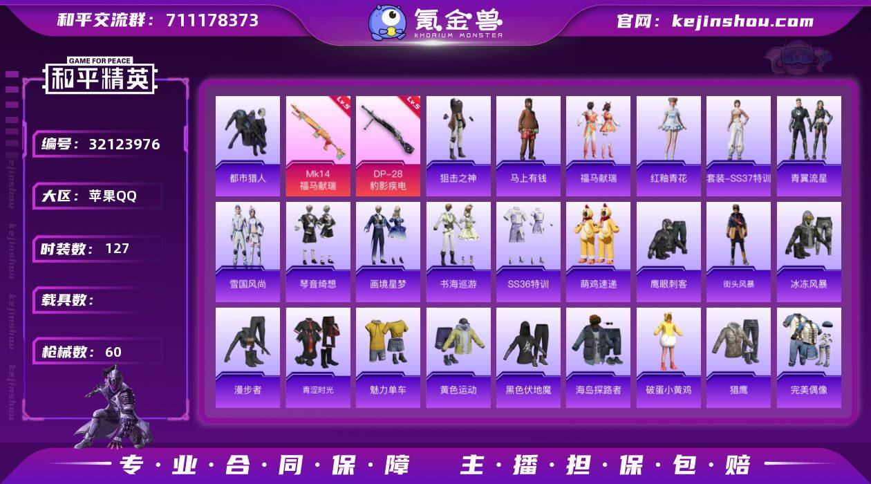 【2特效枪都市猎人】 苹果Q区-13045热力值-27套装-60枪皮 【2特效枪】Mk14-福马献瑞[5级] DP-28-豹影疾电(5级)【1热门】都市猎人【2飞行器】 炫彩糖果飞行器 极意拳锋飞行器 营地ID:1036671566