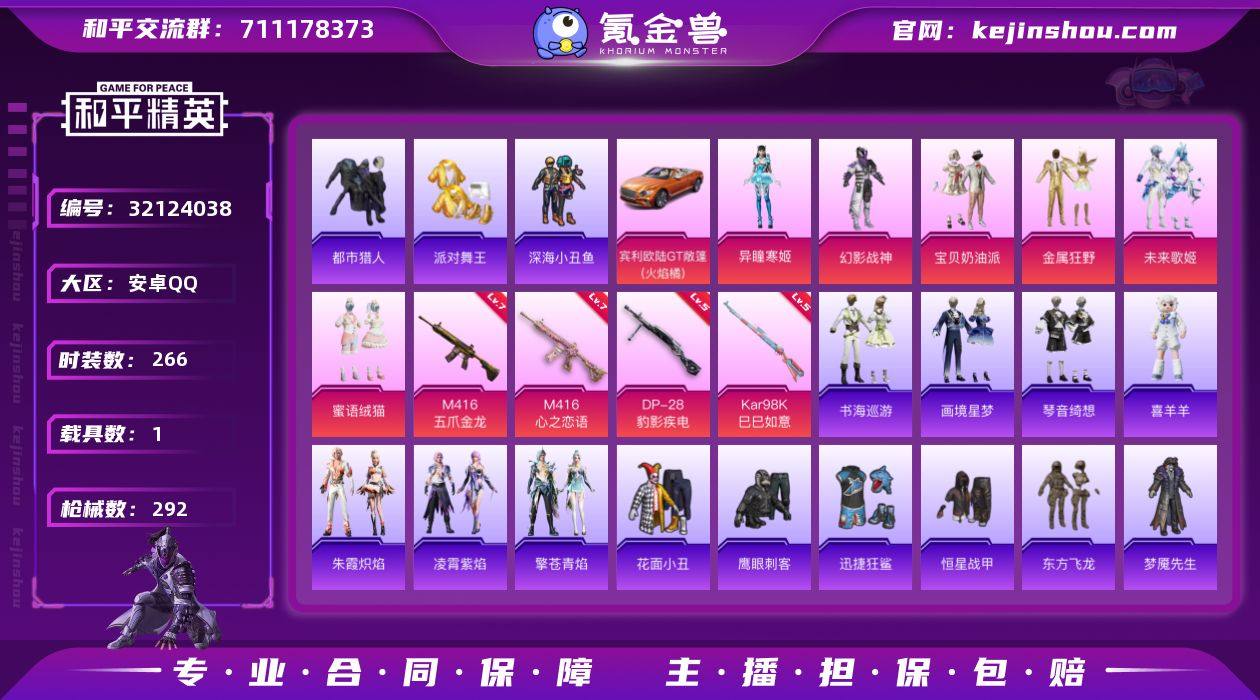 【AZH3006】安卓 手Q【都市金靴子幻影战神 深海小丑鱼暗影哥特 满级五爪金龙M416 满级心之恋语M416 胖达头盔 粉熊背包 1载具】6粉装-5特效枪-1载具-1粉色飞行器-89015热力值-21王牌印记-266套装-292枪皮 【热门品类】:套装-浪漫天命,套装-都市猎人,套装-派对舞王,套装-深海小丑鱼,套装-小丑鱼,套装-忍者信条,套装-SS1特训,套装-龟仙人,套装-暗影哥特,熔岩游骑兵连帽夹克 【粉色套装】:粉装-幻影战神,粉装-宝贝奶油派,粉装-金属狂野,粉装-未来歌姬,粉装-蜜语绒猫,角色-异瞳寒姬 【粉色枪皮等级】:M416-五爪金龙(七级),M416-心之恋语(七级),Kar98K-巳巳如意(五级),Mk14-福马献瑞(五级),DP-28-豹影疾电(五级) 【粉色载具】:宾利欧陆GT敞篷(火焰橘) 【粉色枪皮】:M416-五爪金龙,M416-心之恋语,Kar98K-巳巳如意,Mk14-福马献瑞,DP-28-豹影疾电 【粉色飞行器】:炫彩糖果飞行器 【粉色降落伞】:深海曼妙降落伞,极限特训降落伞,幻影战神降落伞,甜心宝贝降落伞,至尊龙雀降落伞,春暖花开降落伞,精灵迷巫降落伞,星之彼岸降落伞,洛神天依降落伞,海螺星光降落伞,闲梦青缨降落伞,炫光之旅降落伞,圣堂之誓降落伞,千金淑猫降落伞,荧海星豚降落伞,喜羊羊与灰太狼降落伞,炫彩糖果降落伞 【稀有套装】:套装-龟仙人,套装-巳巳如意,套装-炫彩糖果,套装-马上来财,套装-雏菊兔兔,套装-萝兰蝴蝶,套装-小熊娃娃,套装-糖糖葫芦,套装-青团波波,套装-棉花软糖,角色-都市丽猫,角色-摩登魅猫,套装-燕燕于飞,套装-鱼渊荷华,角色-海琴烟,套装-紫幽梦,套装-蓝冰羽,套装-彩虹兔,套装-云朵鹅,套装-雪绒豹,角色-灵公主,套装-朱霞炽焰,套装-凌霄紫焰,套装-擎苍青焰,玩偶服-喜羊羊,套装-书海巡游,套装-画境星梦,套装-琴音绮想 【稀有枪皮】:AUG-冰晶雪宝,AKM-冰凉西瓜,AKM...