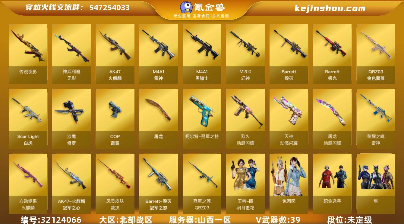 山西一区-45V-7王者武器数-0炫金武器数 【传说武器】:传说夜影 【热门武器】:传说夜影,QBZ03-金色蔷薇,Scar Light-白虎,M200-幻神,柯尔特-冠军之特,炼狱-迷你小钢,M4A1-黑骑士,火麒麟-绝迹,沙鹰-修罗*2,黄金猫猫手套-白鲨,金刚伞 【音效卡】:Barrett-极光音效卡 【皮肤】:幻神-宠儿-2021MVP,M200-幻神-荣耀世冠白鲨,QBZ03-冠军之薇,QBZ03-AG-CFPLS19冠军,AWM-裁决-凤灵皮肤,星神-巅峰荣耀 皮肤,雷神-荣耀之魄,雷神-维纳斯皮肤,火麒麟-冠军之心,火麒麟-心动糖果,毁灭-冠军之怒,毁灭-英雄计划 皮肤,屠龙-破浪逐光 皮肤,擎天-冠军之击 【角色】:电竞教官-云悠悠,隼,零·纪元,王者-瞳-闭月羞花,乔伊教练,嘉年华灵狐,娟娟,零-水下丽影,曼陀罗-X,萌儿,娜塔莉娅,斯沃特-X,蜀雪,铁骑荣耀,兔囡囡,维纳斯,雪莉杨-摸金校尉,职业选手 【人偶武器】:火麒麟-绝迹,白虎-迷你小艾,炼狱-迷你小钢,AWM-灵狐-15周年嘉年华,迷你深渊冰龙,生化手雷-机甲核心 【暴走生化】:超级对讲机 【挑战大师】:冰龙粉碎者-白马银枪,激光毁灭者III-白马银枪,激光毁灭者III 【英雄级武器】:AK47-火麒麟,M4A1-雷神*3,M4A1-黑骑士,Scar Light-白虎,无影-神兵利器,QBZ03-金色蔷薇,烈火-动感闪耀,王者之魄-觉醒版,白虎之魄-觉醒版,Barrett-毁灭,Barrett-极光,M200-幻神,王者风神-觉醒版,沙鹰-修罗*2,COP-雷霆,柯尔特-冠军之特,天神-动感闪耀,屠龙,屠龙-动感闪耀,高爆手雷-竞技荣光*2,高爆手雷-神工天巧,手雷-动感闪耀,高爆手雷-雷暴王者,闪光弹-雷暴,闪光弹-竞技荣光*3,闪光弹-神工天巧*2,闪光弹-雷暴王者,烟雾弹-雷暴,烟雾弹-竞技荣光*2,烟雾弹-神工天巧,烟雾弹-雷暴王者*2 【道具】:AG战队炫彩背包,绿色巨人,灵魂忍者,迷雾幽灵,夺命之镰,防化服*2,金色流...