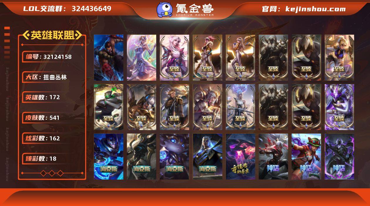 未定级段位-172英雄-541皮肤-162炫彩-2终极-26神话-98限定-64传说-118史诗 【神话皮肤】:十周年纪念安妮,源代码乐芙兰,十五周年纪念希维尔,暗星科加斯,神凰行者瑞羽圣凰艾尼维亚,黎明使者卡尔玛,殿堂传奇薇恩,灰烬骑士莫德凯撒,海克斯科技波比,海克斯科技嘉文四世,海克斯科技斯维因,零之枪骑赫卡里姆,至臻征服者贾克斯,至臻斗魂觉醒萨科,至臻海珀利安小队X09星环灵风迦娜,至臻黑夜使者李青,至臻黑夜使者李青2022,至臻KDA阿卡丽,至臻KDA卡莎,至臻灵能特工伊泽瑞尔,至臻女帝黛安娜,至臻神龙尊者炎龙瑟提,至臻腥红之月亚托克斯,至臻腥红之月亚托克斯2022,至臻战斗学院蕾欧娜 【珍稀头像】:至爱的鹿头像 【热门头像】:爱意绵绵头像 【至臻皮肤】:至臻征服者贾克斯,至臻斗魂觉醒萨科,至臻海珀利安小队X09星环灵风迦娜,至臻黑夜使者李青,至臻黑夜使者李青(2022),至臻灵能特工伊泽瑞尔,至臻KDA阿卡丽,至臻战斗学院蕾欧娜,至臻灵魂莲华拉克丝,至臻女帝黛安娜,至臻KDA卡莎,至臻腥红之月亚托克斯,至臻腥红之月亚托克斯(2022),至臻神龙尊者炎龙瑟提 【臻彩皮肤】:天龙之子迦娜云起龙骧,天龙之子卡莎飞龙乘云,无畏骑士瑟庄妮赤子初心,墨之影武者亚索金墨耀影,冠军典狱长锤石凯旋圣装,冠军之隐劫凯旋圣装,源计划毁灭派克幻灭,玉剑传说翼剑仙珠光,星之守护者金克丝黑洞,山海绘卷科加斯朱红,幻灵战斗兔锐雯梦幻强袭,可爱可爱粉红红布里茨,幻灵战斗队长厄运小姐勇气赞歌,魔女阿卡丽虚荣,净雪之月莫甘娜冬虹,心之钢伊泽瑞尔天纵才华 【年限皮肤】:张辽文远,北辰之威内瑟斯,天龙之子斯莫德,点心宝贝阿木木,龙马烈焰波比 【海克斯皮肤】:海克斯科技斯维因,海克斯科技嘉文四世,海克斯科技波比,零之枪骑赫卡里姆 【情人节限定】:甜心宝贝安妮,觅心萝莉金克丝,觅...