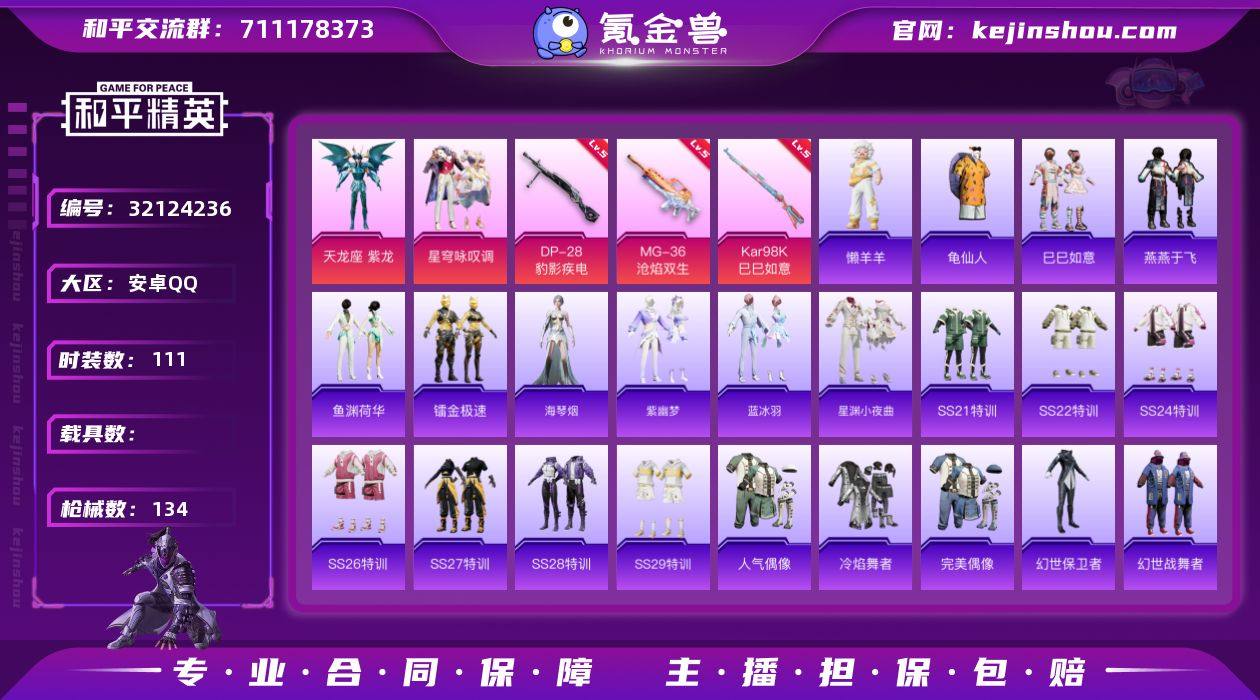 TD263711 安卓 手Q-2粉装-5特效枪-0载具-2粉色飞行器-38334热力值-2王牌印记-111套装-134枪皮 【热门品类】:套装-龟仙人 【粉色套装】:角色-天龙座 紫龙,粉装-星穹咏叹调 【粉色枪皮等级】:UMP45-萌骑冒险(四级),Kar98K-巳巳如意(五级),Mk14-福马献瑞(四级),DP-28-豹影疾电(五级),MG-36-沧焰双生(五级) 【粉色枪皮】:UMP45-萌骑冒险,Kar98K-巳巳如意,Mk14-福马献瑞,DP-28-豹影疾电,MG-36-沧焰双生 【粉色飞行器】:炫彩糖果飞行器,极意拳锋飞行器 【粉色降落伞】:怪笑疯兔降落伞,圣斗士星矢降落伞,星穹咏叹调降落伞,幻彩电音降落伞,无垠阁降落伞,异瞳寒姬降落伞,炫彩糖果降落伞 【稀有套装】:套装-龟仙人,套装-巳巳如意,套装-炫彩糖果,角色-幸运青,套装-马上有钱,套装-燕燕于飞,套装-鱼渊荷华,套装-镭金极速,角色-海琴烟,套装-紫幽梦,套装-蓝冰羽,套装-星渊小夜曲,玩偶服-懒羊羊 【稀有枪皮】:AKM-破晓战魂,AKM-龙的传人,M16A4-幻世战舞者,M16A4-红色方程式,M16A4-蓝色火焰,SCAR-L-夜灯,SCAR-L-炫彩节奏,SCAR-L-玉兔迎春,SCAR-L-红色方程式,M416-红色方程式,M416-蓝色火焰,GROZA-懵萌河马,AUG-耀粉歌者,AUG-黑白懵懵牛,QBZ-彩虹符号,M762-天降萌叽,M762-奇异狩猎者,G36C-懵萌河马,G36C-星穹咏叹调,AC-VAL-快闪甜心,蜜獾-千面幻镜,蜜獾-天降萌叽,UZI-啾咪啾咪,UZI-天降萌叽,UZI-红色方程式,UZI-月影灵韵,UMP45-夜灯,UMP45-生命誓言,UMP45-蓝色火焰,Vector-生命誓言,汤姆逊-天降萌叽,汤姆逊-耀粉歌者,AKS-74U-鬼刀,P90-快闪甜心,P90-巳巳如意,Kar98K-炫彩节奏,Kar98K-红色方程式,M24-炫彩节奏,SKS-糯团青竹,VSS-彩虹符号,Mini14-耀粉歌者,SLR-彩虹符号,莫辛纳甘-懵萌河马,M417-蓝晶绮麟,MK20-H-快闪甜心,MK20-H-净心行者,S686-红...