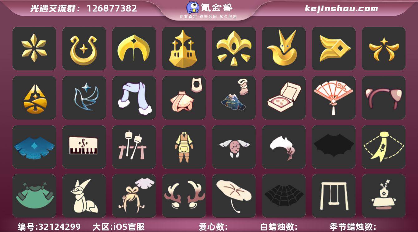 账号类型: 邮箱账号 季节已毕业: 音韵季,魔法季,圣岛季,梦想季,小王子季,风行季,欧若拉季,集结季,归巢季,青鸟季 完成地图: 晨岛,云野,雨林,霞谷,暮土,禁阁,全图毕业 珍稀物品: 透明蝶翼斗,白鸟头,魔法季耳坠,玫瑰花 礼包: 蝙蝠套,围巾,星球斗,小狐狸,绊爱,鹿角,荷叶伞,蜘蛛斗,秋千,茶桌,餐桌,白绒金,福娃,灯笼,彩虹帽,橘子,粽叶,贝壳,黄伞,兔子,南瓜,枯角,雪花,鲤鱼,tgc,猫背饰,星月头饰,彩虹耳钉,彩虹耳机,新年裤,魔法棒,海螺,暗彩装扮,小提琴,透明蛛丝,飞蛾套,雪人鞋,海蓝波浪发型,飞鸟纸伞,蛛网朋克,海龟斗篷,园丁装扮,献瑞折扇礼包,篝火点心礼包,立式钢琴礼包,风之旅人白袍,潮汐套装礼包,粽子发饰礼包,必胜客联动分享披萨背饰礼包,线框斗篷礼包,冬日围巾斗篷 裤子: 武士裤,背带裤,白棉裤,搓澡巾 面具: 黄鼠狼,红狐狸 面饰: 魔法季耳坠,红耳机,黑框眼镜 项链: 围巾 发型: 蝴蝶结,正太,樱花,公主头,虚荣,猫耳,白鸟 斗篷: 白金,红金,白鸟斗,花瓣斗篷,荧蓝斗篷,玫瑰褶边斗篷 配饰: 雨伞,排箫,高音钢琴,吉他,笛子,大铃铛乐器,乐器