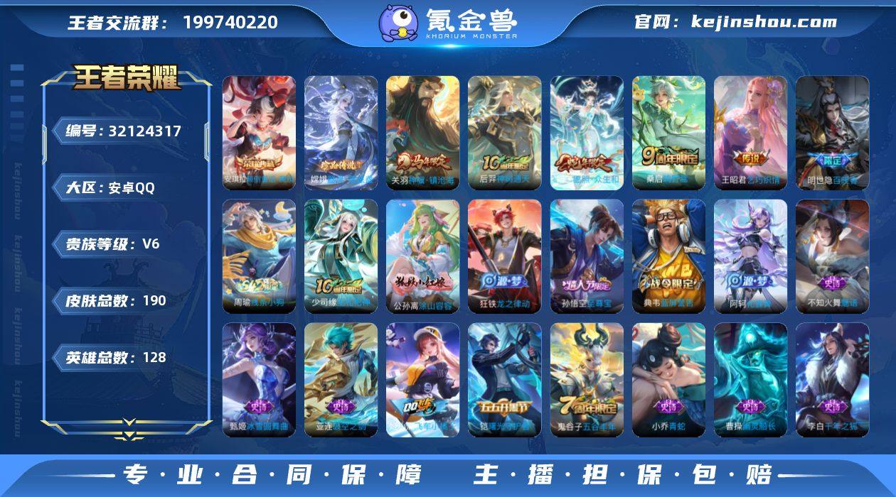 实名: 可修改 性别: 男号 贵族等级: V6 英雄数: 128 皮肤数: 190 荣耀水晶: 颠倒童话·魔镜 珍品传说: 器灵·落星盏 传说皮: 乞巧织情,神树通天,神骥·镇沧海 限定皮: 游园惊梦,梁祝,至尊宝,五谷丰年,鸣野蒿,愿照·众生和 亮点: 【优质装备】:器灵·落星盏,乞巧织情,涂山容容,颠倒童话·魔镜