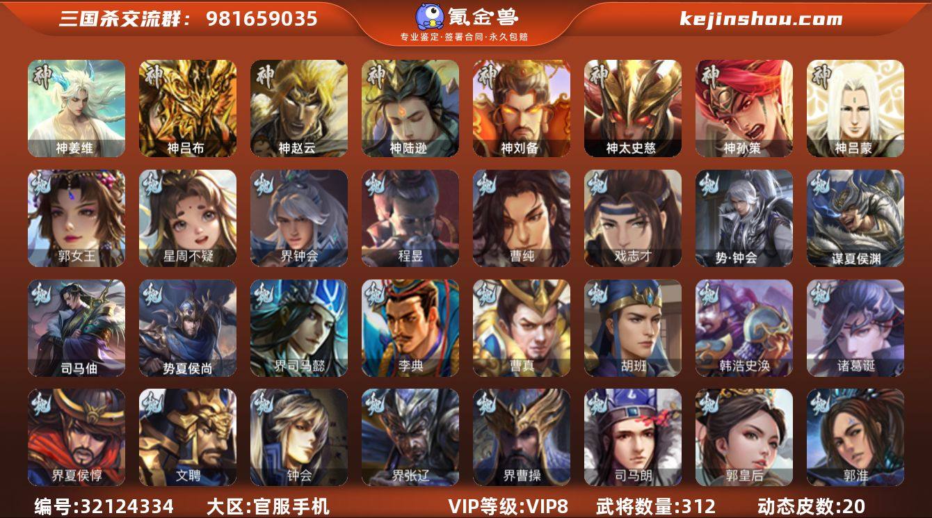 VIP等级:VIP8 官阶:大将军 史诗武将数量:38 动态皮肤数量:20 宝珠数量:48 元宝数量:8368 将魂数量:8210 雁翎数量:30145 心愿积分数量:8377 欢乐豆数量:806 金票数量:11213 卖家说:神姜维,友诸葛,刘烟🚬,四个权一,48宝珠,攒一攒就是势邓艾。节育令天子令。势太神太等38史诗