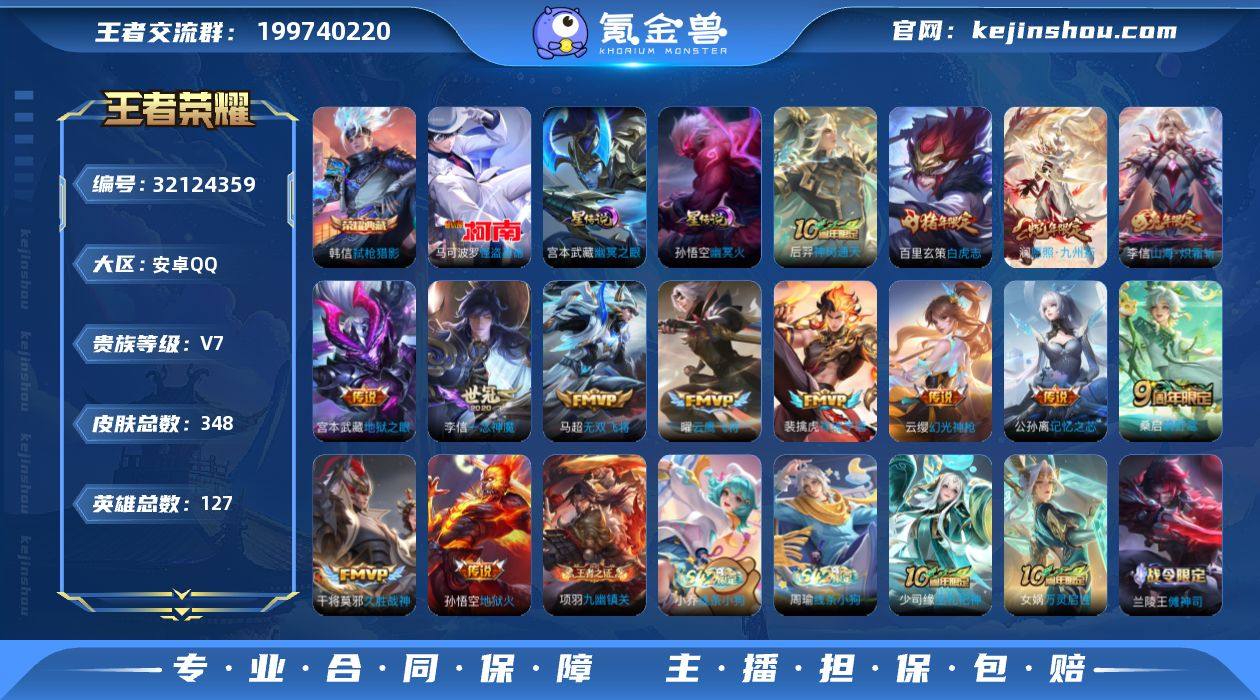 安卓Q-348皮肤-1典藏皮肤-1珍品传说-14传说-93史诗 【英雄全皮】:孙权全皮,猪八戒全皮,敖隐全皮,影全皮,少司缘全皮 【荣耀典藏】:韩信弑枪猎影 【珍品传说】:马可波罗怪盗基德 【传说皮肤】:后羿神树通天,澜愿照九州拓,云缨幻光神枪,裴擒虎祥瑞亨通,桑启鸣野蒿,公孙离记忆之芯,李信山海炽霜斩,马超无双飞将,曜云鹰飞将,李信一念神魔,干将莫邪久胜战神,百里玄策白虎志,宫本武藏地狱之眼,孙悟空地狱火 【限定皮肤】:蔡文姬夏日便利店,虞姬夏日便利店,姜子牙天穹之誓,李白谪仙醉月,狄仁杰阴阳师,赵云皇家上将,鲁班七号狮舞东方,庄周高山流水,高渐离玩趣恶龙,芈月重明,元歌云间偶戏,元歌无心,夏侯惇朔风刀,甄姬游园惊梦,曹操烛龙,典韦穷奇,典韦蓝屏警告,马可波罗暗影游猎,马可波罗山海玄木吟,狄仁杰魔术师,狄仁杰万华元夜,达摩沙漠行僧,项羽海滩派对,老夫子醍醐杖,关羽冰锋战神,程咬金演武夺筹,韩信飞衡,韩信傲雪梅枪,兰陵王金庭之子,亚瑟潮玩骑士王,孙悟空至尊宝,牛魔御旌,后羿圣弓游侠,刘备百相守梦,李元芳云中旅人,钟馗神迹守卫,钟馗驱傩正仪,干将莫邪真爱魔法,雅典娜黎明之约,蔡文姬繁星吟游,鬼谷子原初探秘者,鬼谷子五谷丰年,苏烈千军破阵,百里玄策白虎志,百里玄策原初追逐者,百里守约朱雀志,弈星混沌棋,梦奇顽趣,沈梦溪大漠名商,明世隐疑决卦,裴擒虎李小龙,裴擒虎擒涛扼浪,云中君纤云弄巧,李信山海炽霜斩,盾山御銮,猪八戒西部大镖客,猪八戒猪悟能,上官婉儿梁祝,嫦娥拒霜思,嫦娥暖冬兔眠,鲁班大师探海日志,桑启海盐诗旅,暃星界游侠,艾琳女武神,艾琳流音漫舞,司空震地狱燃心,阿古朵江河有灵,张良古海寻踪,蒙犽百解令,蒙恬荣光圣徽,鬼谷子天穹祈灯,沈梦溪龙舞盛年,鲁班七号蔬乡物语,李元芳蔬乡物语,刘邦剑破天穹...