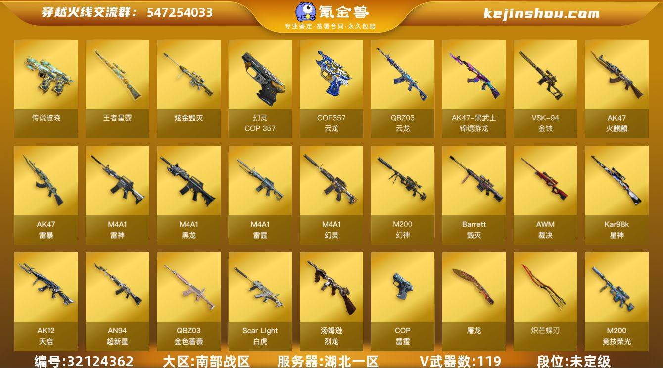 湖北一区-132V-2王者武器数-1炫金武器数 【传说武器】:传说破晓*2 【传说角色】:传说影煞 【热门武器】:传说破晓*2,G36C-幻影,QBZ03-金色蔷薇,M14EBR-玄武,Scar Light-白虎,M200-幻神,柯尔特-荣耀世冠白鲨2023,M200-竞技荣光,青龙之魄,Kar98K-星神,汤姆逊-烈龙,斯泰尔-蝴蝶,5-炽火炎龙,M4A1-小神龙,USP-雷暴,COP 357-幻灵*2,炽芒蝶刃*2 【王者炫金武器】:青龙之魄,王者星霆,炫金毁灭 【音效卡】:M4A1-雷神音效卡,QBZ03-金色蔷薇音效卡,Kar98K-星神音效卡,QBZ03-天罚音效卡,Barrett-碧霄极光音效卡,炼狱-百战金芒-庆典舞曲音效卡 【皮肤】:幻神-宠儿-2021MVP,幻神-电流骇客 皮肤,QBZ03-荣耀世冠白鲨,裁决-流光秘银,裁决-羽掣 皮肤,星神-枪娘默 皮肤,雷神-传奇N9,M4A1-小神龙,M4A1-再燃火线,毁灭-暗月,毁灭-AG-CFPLS15冠军,幻影-破浪逐光 皮肤,修罗-冠军之魂,屠龙-星火燎原*2,屠龙-破浪逐光 皮肤,轻型军用手斧-再燃火线 【角色】:炫,影豹,电竞教官-云悠悠,关小雨,隼,雨墨,机械姬,零·纪元,战地猎狐,王者-魅影,奇洋探员,云海玲珑,葵-阿尔法武装,幻面灵狐,初恋灵狐,飞虎队-X,灵狐-花神,潘多拉-甜心教官,斯沃特-X,雪莉杨 【人偶武器】:5-炽火炎龙,斯泰尔-蝴蝶,Scar Light-马枪,迷你生化手雷*3,深渊终结者手雷 【挑战大师】:神圣爆裂者III,AK47-冰龙粉碎者,激光毁灭者III-白马银枪 【英雄级武器】:AK47-火麒麟,M4A1-黑龙,M4A1-雷神,AK12-天启,AN94-超新星,M4A1-雷霆,AK47-雷暴,Scar Light-白虎,M4A1-幻灵,M14EBR-玄武,QBZ03-天罚,G36C-幻影,QBZ03-云龙,黑武士-锦绣游龙,QBZ03-金色蔷薇,HK417-朱雀-电竞之星,机械迷城-穹宇,Barrett-毁灭,AWM-裁决,M200-幻神,Kar