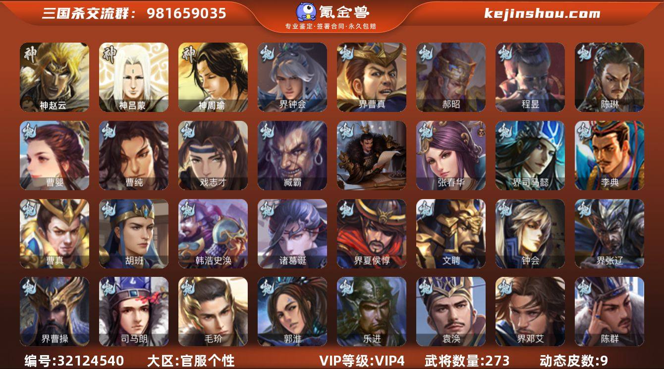 【4195】官阶:骠骑将军;VIP等级:VIP4;史诗武将数量:22;动态皮肤数量:9;武将总数:273;史诗宝珠数量:13;将魂数量:842;神将:1;魏国史诗武将:4;蜀国史诗武将:6;吴国史诗武将:1;群史诗武将:6 神赵云,界钟会,界曹真,郝昭,陈琳,曹婴,曹纯,戏志才,程昱,谋诸葛亮,谋赵云,谋马超,诸葛瞻,界黄忠,董允,界朱然,麹义,公孙康,谋张角,谋吕布,星董卓,兀突骨,神吕蒙,神周瑜,SP关羽,SP蔡文姬,乐进,曹昂,诸葛诞,朱灵,文聘,SP姜维,张春华,钟会,曹冲,郭淮,满宠,界王异,界曹操,界司马懿,界夏侯惇,界张辽,界许褚,界郭嘉,李典,曹真,韩浩史涣,陈群,曹叡,钟繇,司马朗,王基,吕虔,蒯越蒯良,界邓艾,界曹植,卞夫人,袁涣,毛玠,阮慧,胡班,臧霸,唐咨,势陈到,SP孙尚香,夏侯霸,马良,关兴张苞,廖化,界马岱,关平,简雍,刘封,界法正,界关兴张苞,界刘备,界张飞,界赵云,界马超,SP徐庶,吴懿,周仓,张松,刘谌,夏侯氏,马忠,界诸葛亮,界伊籍,界庞统,吕凯,张翼,费祎,糜夫人,王甫赵累,向宠,谋庞统,谋张飞,霍峻,诸葛果,蒋琬费祎,糜芳傅士仁,甘夫人,鲁肃,凌操,诸葛恪,诸葛瑾,孙鲁育,程普,韩当,潘璋马忠,虞翻,界甘宁,界吕蒙,界黄盖,界周瑜,界大乔,界陆逊,孙鲁班,朱桓,顾雍,孙休,全琮,阚泽,孙登,界孙权,陆绩,吕岱,周鲂,陆抗,许贡,卫温诸葛直,界吴国太,界虞翻,界潘璋马忠,张温,陈武董袭,蒋钦,吕范,界顾雍,谋吕蒙,界朱治,孟达,友庞统,伏完,刘协,界袁术,SP赵云,张宝,伏皇后,李儒,界于吉,华雄,袁术,界华佗,界吕布,公孙瓒,蔡夫人,公孙渊,郭图逢纪,张鲁,严白虎,SP黄月英,刘虞,曹节,蔡邕,SP太史慈,张梁,卢植,刘琦,界颜良文丑,张济,樊稠,张绣,星徐晃,界公孙瓒,韩遂,荀谌,孔融,羊祜,马元义,阎圃,谋刘赪,王濬,谋卢植,谋高顺,鲍信,张任,势田丰,乐就,仲帝袁术,神鲁肃-九州为局,曹昂-竭战麟伤(动态),曹纯-虎年春节(动态),诸葛亮-龙年限定(动态),诸葛果-蛇年限定(动态),关银...