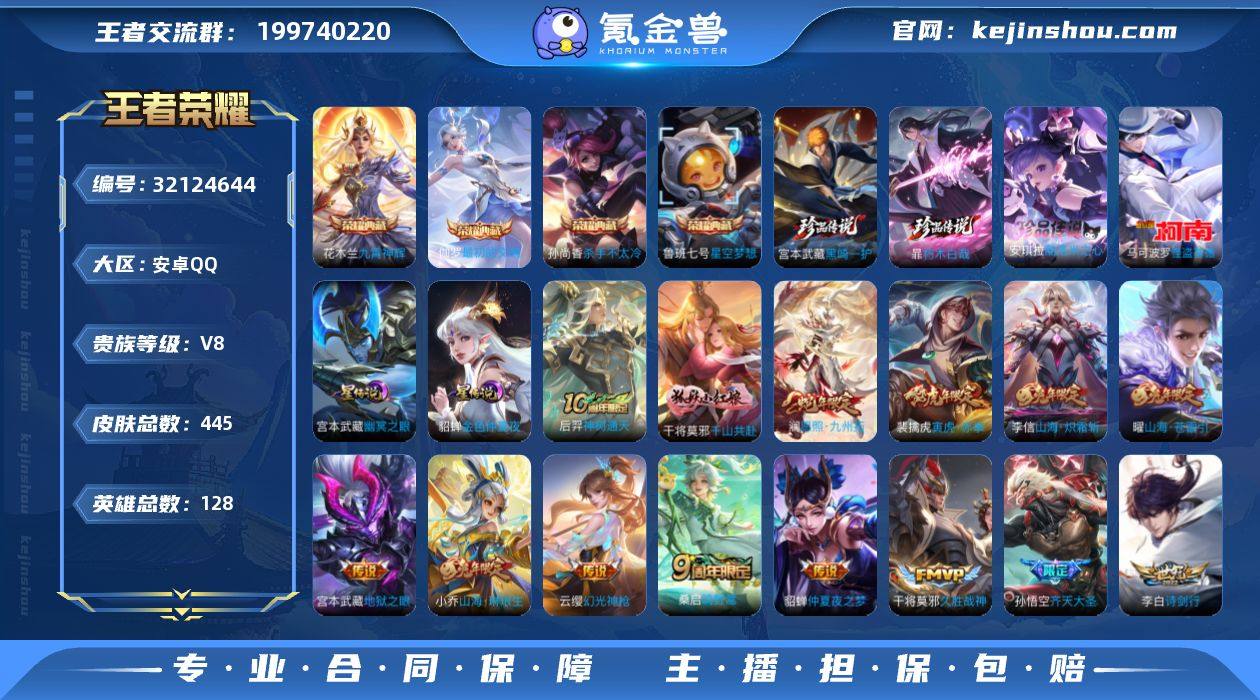 【店铺主推·杀手不太冷·星空梦想·九霄神辉·最初的交响·黑崎一护·朽木白哉·酷洛米之心·怪盗基德·千山共赴·愿照九州拓·马可波罗妄想实况·燃星之曲·齐天大圣·山海琳琅生·山海苍雷引·山海炽霜斩·寅虎赤拳·乞巧织情·瑞麟志·埋骨钱·多按键·多款热门皮·可二次】YXw17999-安卓Q-128英雄-445皮肤-15王者印记-300铭文-贵族积分8w【贵族8】【4典藏·4珍品·2星传说·22传说·1天幕·26按键】【因赛季更新游戏段付以上号为准!】 【英雄全皮】:刘禅全皮,高渐离全皮,孙权全皮,苍全皮,鬼谷子全皮,沈梦溪全皮,狂铁全皮,敖隐全皮,暃全皮,戈娅全皮,空空儿全皮,影全皮 【荣耀典藏】:孙尚香杀手不太冷,鲁班七号星空梦想,花木兰九霄神辉,伽罗最初的交响 【珍品传说】:宫本武藏黑崎一护,暃朽木白哉,安琪拉酷洛米之心,马可波罗怪盗基德 【星元皮肤】:貂蝉金色仲夏夜,宫本武藏幽冥之眼 【天幕】:共赏芳华天幕 【内测皮肤】:孙尚香蔷薇恋人,艾琳女武神,高渐离玩趣恶龙,狂铁特工战影 【传说皮肤】:后羿神树通天,干将莫邪千山共赴,澜愿照九州拓,云缨幻光神枪,桑启鸣野蒿,马可波罗妄想实况,花木兰燃星之曲,孙悟空齐天大圣,小乔山海琳琅生,曜山海苍雷引,李信山海炽霜斩,李白诗剑行,裴擒虎寅虎赤拳,王昭君乞巧织情,虞姬启明星使,张良黄金白羊座,干将莫邪久胜战神,花木兰冠军飞将,梦奇胖达荣荣,貂蝉仲夏夜之梦,宫本武藏地狱之眼,孙悟空地狱火 【限定皮肤】:暃埋骨钱,蔡文姬夏日便利店,大乔绒语心约,虞姬夏日便利店,姜子牙天穹之誓,狄仁杰阴阳师,小乔山海琳琅生,赵云皇家上将,墨子神迹守卫,孙尚香蔷薇恋人,庄周高山流水,高渐离死亡摇滚,高渐离玩趣恶龙,阿轲迷踪丽影,钟无艳超时空战士,扁鹊奇幻香踪,白起夜都怪侠,芈月幻夜卜梦,周瑜真爱至上,元歌云间偶戏,元歌无心,夏侯惇朔风刀...