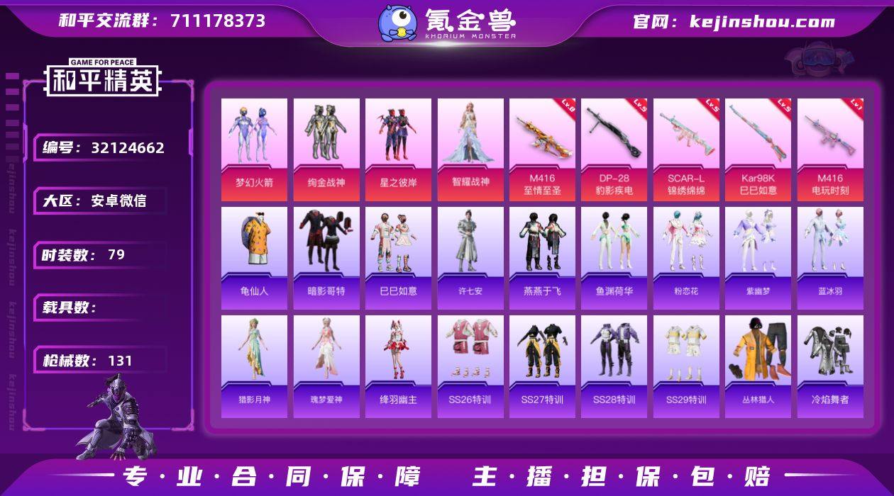 【AZH3008】安卓 微信【梦幻火箭绚金战神暗影哥特 至情至圣M416】4粉装-8特效枪-0载具-3粉色飞行器-42062热力值-6王牌印记-79套装-131枪皮 【热门品类】:粉装-梦幻火箭,套装-龟仙人,套装-暗影哥特 【粉色套装】:粉装-梦幻火箭,粉装-绚金战神,粉装-星之彼岸,角色-智耀战神 【粉色枪皮等级】:SCAR-L-锦绣绵绵(五级),M416-至情至圣(八级),M416-电玩时刻(一级),UMP45-萌骑冒险(四级),AKS-74U-森灵之息(五级),Kar98K-巳巳如意(五级),Mk14-福马献瑞(二级),DP-28-豹影疾电(五级) 【粉色枪皮】:SCAR-L-锦绣绵绵,M416-至情至圣,M416-电玩时刻,UMP45-萌骑冒险,AKS-74U-森灵之息,Kar98K-巳巳如意,Mk14-福马献瑞,DP-28-豹影疾电 【粉色飞行器】:炫彩糖果飞行器,镜域双华-灵镜之阶,暮色之舞飞行器 【粉色降落伞】:梦幻火箭降落伞,星之彼岸降落伞,齐天大圣降落伞,萌酷奶龙降落伞,江南烟雨降落伞,墨龙九天降落伞,千金淑猫降落伞,临安公主降落伞,动力核心降落伞,无垠阁降落伞,炫彩糖果降落伞 【稀有套装】:套装-龟仙人,套装-巳巳如意,套装-雪国风尚,套装-炫彩糖果,套装-马上有钱,角色-许七安,套装-燕燕于飞,套装-鱼渊荷华,套装-粉恋花,套装-紫幽梦,套装-蓝冰羽,角色-猎影月神,角色-瑰梦爱神,角色-绛羽幽主,套装-雨过天青,套装-红釉青花 【稀有枪皮】:AUG-冰晶雪宝,AKM-江南烟雨,AKM-破晓战魂,AKM-霓虹街区,M16A4-幻世战舞者,SCAR-L-红色方程式,M416-红色方程式,AUG-天降萌叽,QBZ-彩虹符号,M762-天降萌叽,蜜獾-天降萌叽,UZI-啾咪啾咪,UZI-天降萌叽,UMP45-繁龙极客,UMP45-蓝色火焰,UMP45-绒宝小鹅,UMP45-极意拳锋,Vector-焰鹰斗篷,汤姆逊-天降萌叽,野牛-沙丘之主,P90-巳巳如意,Kar98K-梦幻火箭,AWM-焰鹰斗篷,SKS-炫彩节奏,VSS-星之彼岸,Mini14-梦幻...