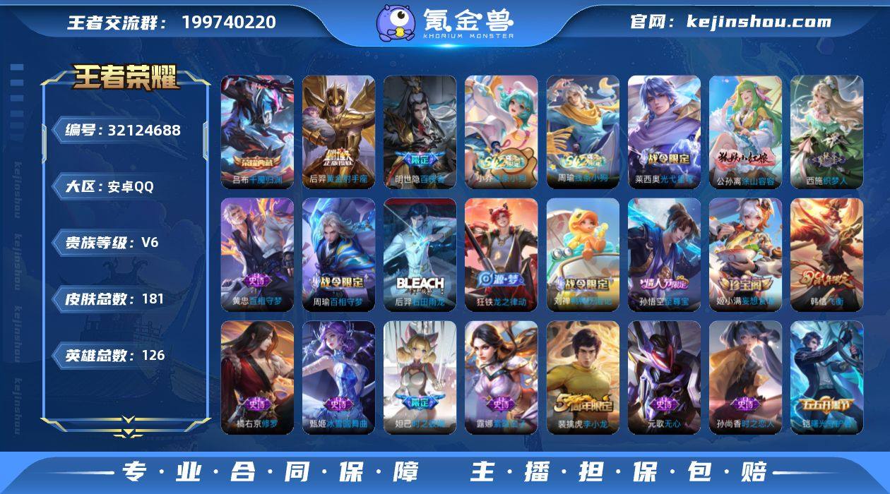 贵族等级:V6 典藏皮肤数:1 珍品无双皮肤数:0 无双皮肤数:0 珍品传说皮肤数:0 传说皮肤数:1 史诗皮肤数:47 皮肤数:181 英雄数:126 段位:荣耀王者