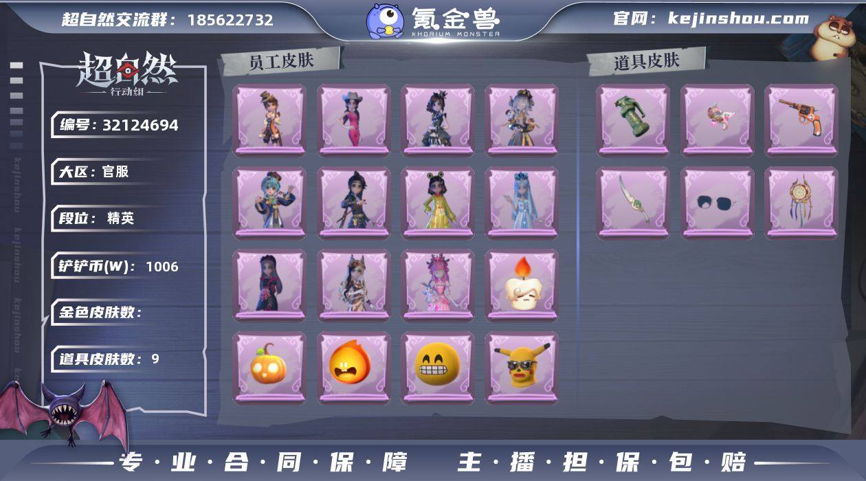 紫皮11;道具皮9;皮肤:小黄-呱呱雨衣,薇薇安-白光莹,莉莉-除妖小师妹,阿念-庆宴绮愿,阿念-迷途僵宝,莉莉-情公主,小黄-异色序曲,逍遥-绣春逍影,爱丽丝-耀眼的你,爱丽丝-冰公主,爱丽丝-丝缕哀歌;道具:音响-鸣沙鼓,闪光弹-金戈玄铜,转轮手枪-新星时代,急救包-蔷薇物语,电击枪-权杖的许诺,刺刀-碧络琅环,夜视仪-金丝眼镜,电击枪-甜蜜泡泡枪,音响-咏叹调;美妆:美妆-暗夜小恶魔;饰品:头饰-烛光纪念,头饰-大葱明头套,头饰-火爆了头套,头饰-鱼头怪头套,头饰-炙热烧烤,头饰-饺饺者头套,头饰-卑微头套,头饰-惊魂南瓜头套,头饰-嘻嘻头套,头饰-哈士奇头套,头饰-呆滞头套,头饰-面具马头套,头饰-芝麻糊汤圆,头饰-园丁鲨鲨头套,头饰-烈焰红唇头套,头饰-滑稽头套,头饰-马上有钱,头饰-小狗蛇点点头套,头饰-鳄霸天头套,头饰-萨卡班甲鱼头套,头饰-像素朋克墨镜,头饰-后室幸存者头套,挂饰-天使消失的年代,挂饰-未竟乐园,挂饰-钗头凤,挂饰-尘封旧事,背饰-夜浮船,背饰-牛啤背包,背饰-绒团小狐狸;动作:动作-舞台中心,动作-luvaboy,动作-新年摇,动作-一点点星星摇,动作-DL摇,动作-KT猫摇,动作-拜年,动作-抬手,动作-要糖,动作-举牌;工牌背景:工牌背景-永恒之阶,工牌背景-雷霆轩,工牌背景-童话扉页,工牌背景-情语塔,工牌背景-冰晶宫,工牌背景-鸢尾花,工牌背景-点点萌伴,工牌背景-圣光之誓,工牌背景-甜心的囚笼,工牌背景-心同野鹤;工牌动作:工牌动作-蜕变,工牌动作-元气剪刀手,工牌动作-春色盈怀,工牌动作-轻躯鹤立,工牌动作-虔诚之姿;员工:逍遥,员工-艾伦,员工-小满,员工-薇薇安,员工-爱德华,员工-零,员工-兰,员工-巫铃儿,员工-阿念,员工-爱丽丝,员工-临云,员工-小黄,员工-莉莉;累充554元;铲铲币100.6万;金砖2;段位:精英Ⅰ;魔盒等级:21