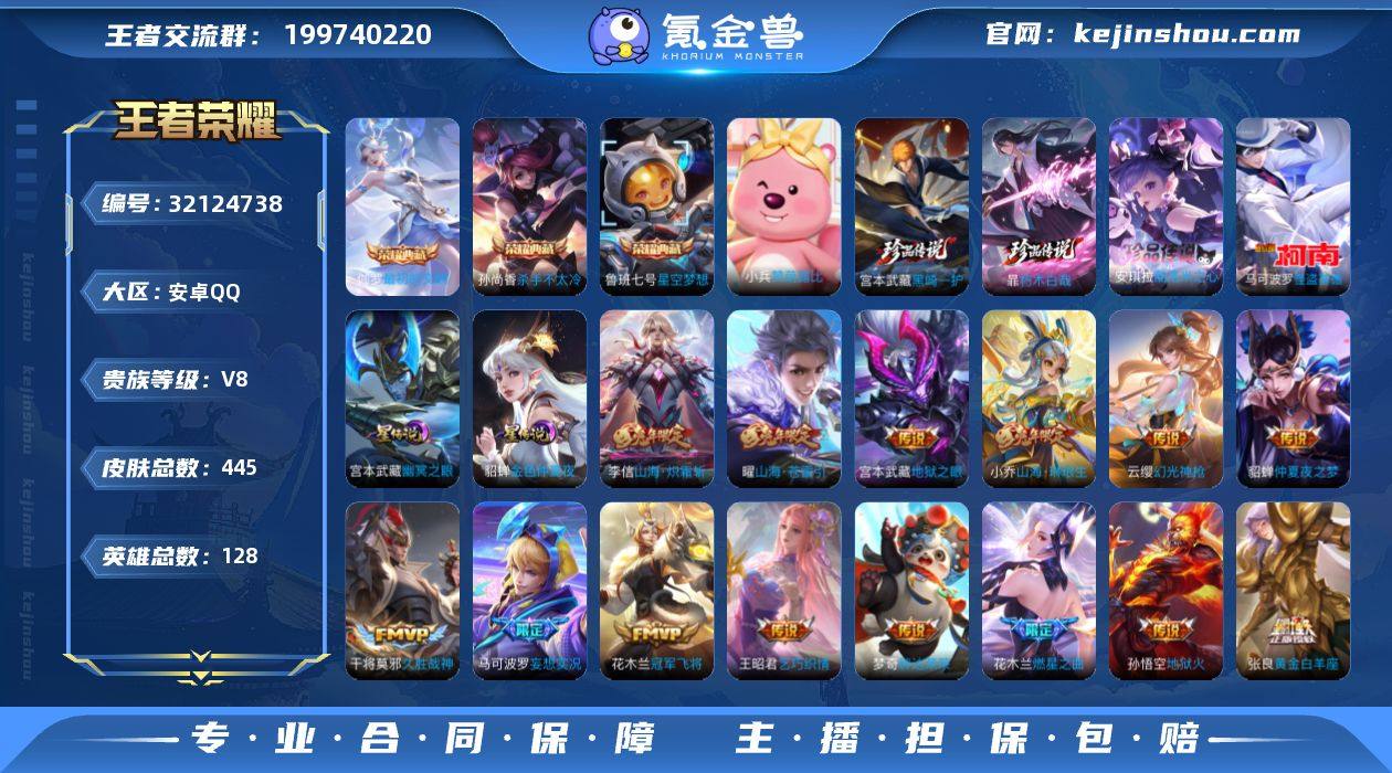 冷·星空梦想·九霄神辉·最初的交响·黑崎一护·朽木白哉·酷洛米之心·怪盗基德·千山共赴·愿照九州拓·马可波罗妄想实况·燃星之曲·齐天大圣·山海琳琅生·山海苍雷引·山海炽霜斩·寅虎赤拳·乞巧织情·瑞麟志·埋骨钱·多按键·多款热门皮·可二次】w17999-安卓Q-128英雄-445皮肤-15王者印记-300铭文-贵族积分8w【贵族8】【4典藏·4珍品·2星传说·22传说·1天幕·26按键】【因赛季更新游戏段付以上号为准!】 【英雄全皮】:刘禅全皮,高渐离全皮,孙权全皮,苍全皮,鬼谷子全皮,沈梦溪全皮,狂铁全皮,敖隐全皮,暃全皮,戈娅全皮,空空儿全皮,影全皮 【荣耀典藏】:孙尚香杀手不太冷,鲁班七号星空梦想,花木兰九霄神辉,伽罗最初的交响 【珍品传说】:宫本武藏黑崎一护,暃朽木白哉,安琪拉酷洛米之心,马可波罗怪盗基德 【星元皮肤】:貂蝉金色仲夏夜,宫本武藏幽冥之眼 【天幕】:共赏芳华天幕 【内测皮肤】:孙尚香蔷薇恋人,艾琳女武神,高渐离玩趣恶龙,狂铁特工战影 【传说皮肤】:后羿神树通天,干将莫邪千山共赴,澜愿照九州拓,云缨幻光神枪,桑启鸣野蒿,马可波罗妄想实况,花木兰燃星之曲,孙悟空齐天大圣,小乔山海琳琅生,曜山海苍雷引,李信山海炽霜斩,李白诗剑行,裴擒虎寅虎赤拳,王昭君乞巧织情,虞姬启明星使,张良黄金白羊座,干将莫邪久胜战神,花木兰冠军飞将,梦奇胖达荣荣,貂蝉仲夏夜之梦,宫本武藏地狱之眼,孙悟空地狱火 【限定皮肤】:暃埋骨钱,蔡文姬夏日便利店,大乔绒语心约,虞姬夏日便利店,姜子牙天穹之誓,狄仁杰阴阳师,小乔山海琳琅生,赵云皇家上将,墨子神迹守卫,孙尚香蔷薇恋人,庄周高山流水,高渐离死亡摇滚,高渐离玩趣恶龙,阿轲迷踪丽影,钟无艳超时空战士,扁鹊奇幻香踪,白起夜都怪侠,芈月幻夜卜梦,周瑜真爱至上,元歌云间偶戏,元歌无心,夏侯惇朔风刀,甄姬游园惊梦,甄姬...