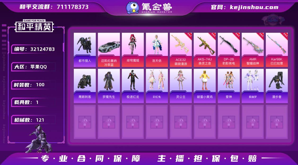 DYH18036苹果手Q-1载具-2粉装-6特效枪-100套装-121枪皮-6王牌印记-超级王牌5星-33772热力值【1载具】迈凯伦塞纳(冷萃蓝)【2粉装】角色-洛天依,角色-绯穹魔姬【6特效枪】AMR-智耀战神[3级],DP-28-豹影疾电[5级],Mk14-福马献瑞[5级],ACE32-萌骑漫游[3级],Kar98K-巳巳如意[5级],AKS-74U-森灵之息[5级]【1稀有】都市猎人【6飞行器】云朵驼驼飞行器,破刃行动尾迹,马上有福飞行器,狂鲨锋刃飞行器,登顶巅峰飞行器,异域银装飞行器【212其它衣服和枪皮】战术大师,琴音绮想,鹤鸣,灼焰舞者,酒红色名流,SS33特训,潮流炫酷,缤纷果语,龙魂突击队,破蛋小黄鸡,冷焰舞者,幻影武者,疯狂小兔子,SS34特训,王牌教练,猛禽,沙漠毒蛇,角色-瑰梦爱神,黄色伏地魔,SS32特训,青翼流星,恋语绒绒,黄色运动,长空猛禽,大橘大利,竞技名士,角色-孙斩天,燕燕于飞,异域银装,黄色名流,鱼渊荷华,极速红龙,角色-灵公主,白色伏地魔,竞技达人朋克,猎鹰,雪国风尚,SS37特训,元素星魂,冰冻风暴,马上有钱,狙击之神,红色运动,鹰眼刺客,小鸟芋圆,SS31特训,狂鲨锋刃,画境星梦,阳光菠萝,福马献瑞,海盐绵绵冰,双彩圣灵,紫幽梦,春日漫步,擎苍青焰,耀粉歌者,云朵鹅,游乐,滨海厨神,特战装甲,SS36特训,顶瓜瓜,书海巡游,黑色伏地魔,薄荷星砂,光之冒险,绮丽涂鸦,湖蓝色名流,蓝彩潮人,漫步者,云魄琉璃,粉恋花,街头潮人,漫游都市,凌霄紫焰,深蓝色名流,彩虹兔,红釉青花,完美偶像,梦魇先生,SS35特训,冰川特警,玲珑侠影,青年教官,蓝冰羽,星影赞美诗,玩偶服-美羊羊,特训学院,朱霞炽焰,旭日情侣,雨过天青,海岛探路者,龙的传人,魅力单车,雪绒豹,元气之梦,蓝色运动,十字弩-燕燕于飞,P92-凌霄紫焰,AKM-霓彩脉冲,GROZA-紫矿核心,SCAR-L-冷漠罗丽,Kar98K-洛神天依,AKM-涂鸦街区,烟雾弹-冰氧夏日,AUG-绝对恒星,平底锅-紫幽梦,UZI-影袭,突击盾牌-绝对恒星,Mk14-阳光菠