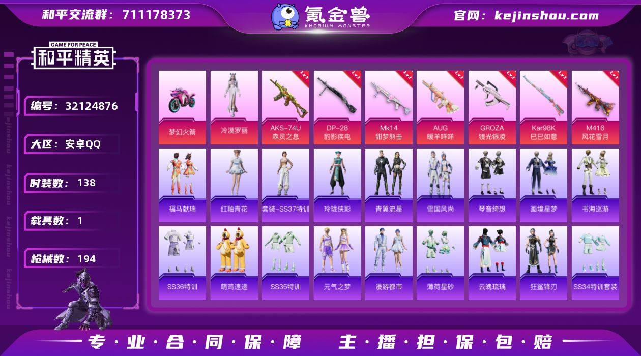 可二次实名【满级M4风花雪月9特效枪1载具1粉装 秒换绑不用等】 安卓Q区-54719热力值-138套装-194枪皮 【1载具】 双人摩托梦幻火箭【1粉装】 角色-冷漠罗丽【9特效枪】 M416-风花雪月(7级) AKS-74U-森灵之息(5级) Mk14-福马献瑞(4级) ACE32-萌骑漫游(5级) Kar98K-巳巳如意(5级) Mk14-甜梦熊击(5级) AUG-暖羊咩咩(5级) GROZA-镜光银凌(5级) DP-28-豹影疾电(5级)【212热门】 破蛋小黄鸡 极速红龙 白色伏地魔 SS27特训 SS25特训 SS24特训 SS23特训 SS22特训 Mk47-洛神天依 Kar98K-王子的夏天 GROZA-乌木金纹 SCAR-L-玉兔迎春 M762-天降萌叽 M762-彩虹符号 Mk47-乌木金纹 UMP45-蓝色火焰 DBS-彩虹符号 MG3-幻世战舞者 AKM-虎虎生威 M416-蓝色火焰 GROZA-彩虹符号 长空猛禽 特训学院 青涩时光 青年教官 骑行爱好者 魅力单车 猎鹰 蓝色运动 橘黑制服 竞技达人朋克 黄色运动 黄色伏地魔 红色运动 黑色伏地魔 纯真浪花 春日漫步 S1897-糯团青竹 AA12-G-雨过天青 沙漠之鹰-雨过天青 平底锅-画境星梦 海琴烟 P90-紫矿核心 GROZA-紫矿核心 玲珑侠影 M16A4-雨过天青 顶瓜瓜 雨过天青 冰河战士 MG-36-薄荷星砂 GROZA-福马献瑞 恋语绒绒 SS34特训 漫游都市 蜜獾-鸡智如我 S1897-荧海星豚 撬棍-冰晶雪宝 SS18特训 福马献瑞 大橘大利 SS14特训 SS17特训 彩虹兔 SS19特训 燃点复合弓-罪夜之冕 SS20特训 SS21特训 蓝冰羽 龙魂突击队 SS29特训 破片手榴弹-爆破雪人 SS30特训 ACE32-冰晶雪宝 鱼渊荷华 青翼流星 SS28特训 PKM-啾咪啾咪 海盐绵绵冰 M16A4-冰河战士 燕燕于飞 SS31特训 SS33特训 SS32特训 巳巳如意 蜜獾-精灵梦叶罗丽 紫幽梦 雪绒豹 游乐 MG3-霓彩脉冲 狂鲨锋刃 SS