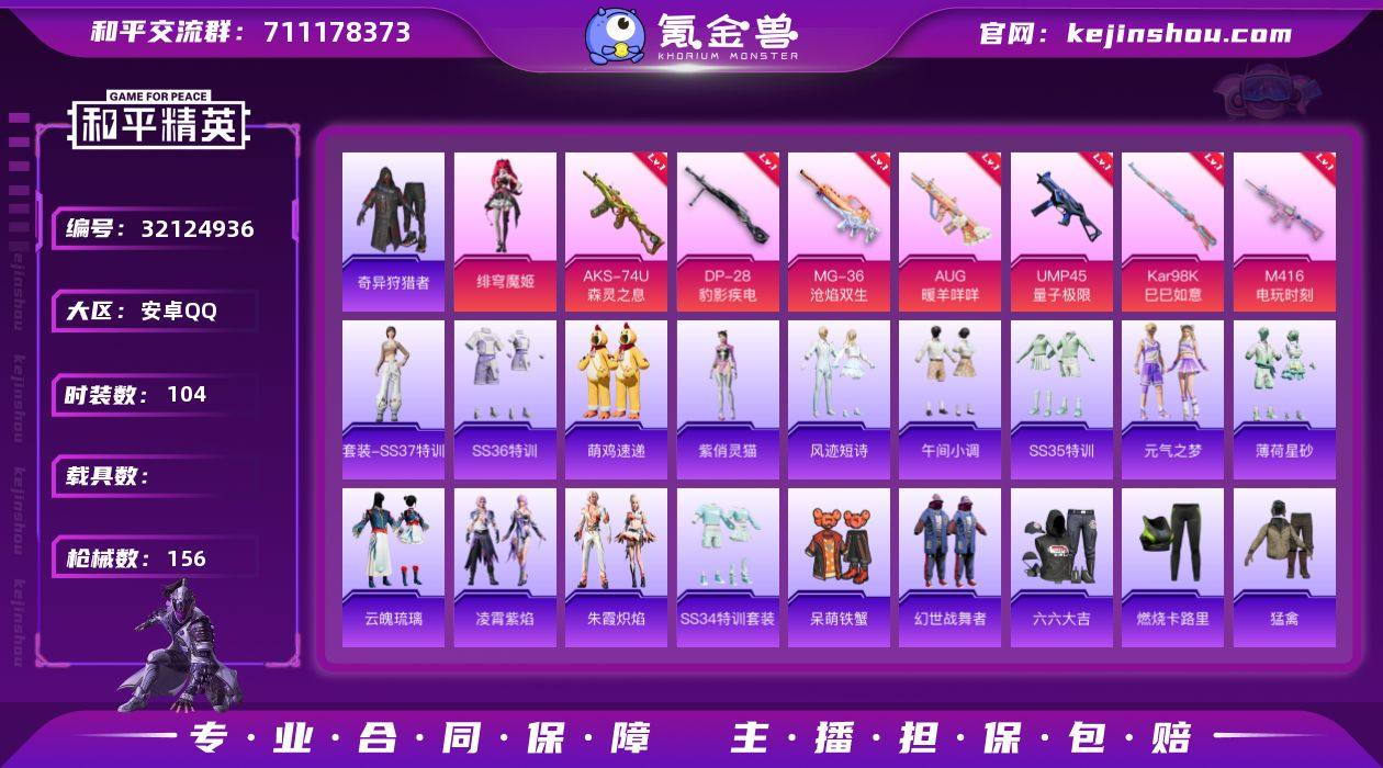 【3特效枪1载具 V社交 游戏正常】 安卓V区-20117热力值-45套装-84枪皮 【1载具】 迈凯伦塞纳(冷萃蓝)【3特效枪】 Mk14-福马献瑞(5级) 蜜獾-异瞳寒姬(5级) DP-28-豹影疾电(5级)【101热门】 破蛋小黄鸡 DBS-彩虹符号 MG3-幻世战舞者 特训学院 魅力单车 蓝色运动 橘黑制服 黄色运动 红色运动 黑色伏地魔 海岛探路者 S1897-糯团青竹 Mini14-绯穹魔姬 P90-紫矿核心 GROZA-紫矿核心 顶瓜瓜 瑰石海星 MG-36-薄荷星砂 GROZA-福马献瑞 SS34特训 朱霞炽焰 AWM-天降萌叽 福马献瑞 大橘大利 凌霄紫焰 蓝冰羽 破片手榴弹-爆破雪人 ACE32-冰晶雪宝 擎苍青焰 SS32特训 爆炸猎弓-花中眠 紫幽梦 极速光影 雪绒豹 游乐 MG3-霓彩脉冲 SS36特训 老实芭蕉 魂电 粉恋花 JS9-凌霄紫焰 MG-36-凌霄紫焰 蜜獾-启元战纹 马上有钱 ARX-凌霄紫焰 Kar98K-星穹咏叹调 VSS-虎痴许褚 P92-凌霄紫焰 平底锅-凌霄紫焰 狙击之神 破片手榴弹-海盐豹豹 UMP45-海盐豹豹 Mk14-紫晶流影 兰香蝶语 AKS-74U-辉羽雀灵 M417-玩趣呆呆 Mk14-薄荷星砂 AUG-紫晶流影 AMR-鸡智如我 破片手榴弹-咒蚀之裁 燃烧瓶-福马献瑞 PKM-紫幽梦 Mk14-紫幽梦 AKM-涂鸦街区 S12K-智耀战神 SLR-圣穹绘梦 沙漠之鹰-圣穹绘梦 SCAR-L-彩虹符号 SS35特训 S1897-紫幽梦 P92-紫幽梦 薄荷星砂 平底锅-紫幽梦 元气之梦 夜瞳黯灵 S12K-霓彩脉冲 AKM-霓彩脉冲 十字弩-异域银装 R45-幻彩电音 破片手榴弹-拽到爆炸 信号枪-异瞳寒姬 Famas-霓彩脉冲 SVD-霓彩脉冲 S12K-极意拳锋 SLR-霓彩脉冲 UMP45-极意拳锋 SVD-云朵鹅 铝热弹-炫彩糖果 M762-云朵鹅 UZI-炫彩糖果 AUG-冰晶雪宝 SPAS-12-云朵鹅 Mini14-鸡智如我 MK20-H-狂鲨锋刃 萌鸡速递 沙漠之鹰-云