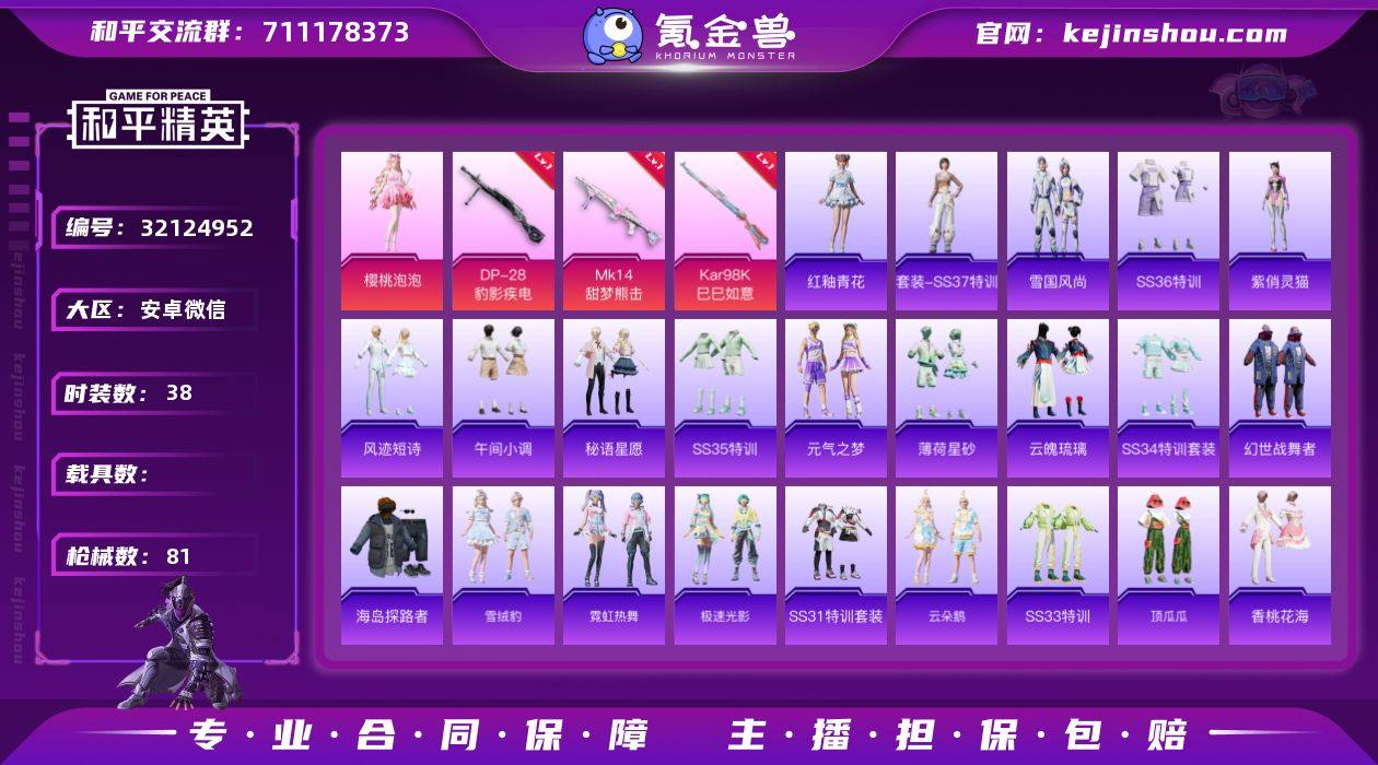 可二次实名【5特效枪1粉装 V社交 游戏正常】 安卓V区-20411热力值-38套装-81枪皮 【1粉装】 角色-樱桃泡泡【5特效枪】 Mk14-福马献瑞(1级) AA12-G-萌骑幻想(4级) Kar98K-巳巳如意(5级) Mk14-甜梦熊击(5级) DP-28-豹影疾电(5级)【83热门】 浪漫天命 M762-彩虹符号 MG3-幻世战舞者 黑色伏地魔 海岛探路者 AA12-G-雨过天青 沙漠之鹰-雨过天青 M16A4-雨过天青 顶瓜瓜 M249-无面战甲 雨过天青 MG-36-薄荷星砂 GROZA-福马献瑞 SS34特训 蜜獾-鸡智如我 福马献瑞 大橘大利 ACE32-冰晶雪宝 SS31特训 SS33特训 SS32特训 巳巳如意 极速光影 雪绒豹 SS36特训 AKM-江南烟雨 异域银装 战术大师 马上来财 蜜桃派对 蜜獾-启元战纹 云朵鹅 狙击之神 破片手榴弹-海盐豹豹 UMP45-海盐豹豹 M417-玩趣呆呆 Mk14-薄荷星砂 Mini14-香桃花海 破片手榴弹-巳巳如意 SCAR-L-星途旅人 AKS-74U-鸡智如我 烟雾弹-冰氧夏日 平底锅-属我最6 SS35特训 UZI-月影灵韵 薄荷星砂 破片手榴弹-星途旅人 霓虹热舞 元气之梦 S12K-霓彩脉冲 AKM-霓彩脉冲 AUG-异域银装 DBS-风迹短诗 十字弩-异域银装 雪国风尚 莫辛纳甘-风迹短诗 MK12-风迹短诗 Mk47-风迹短诗 R45-幻彩电音 蜜獾-风迹短诗 Famas-霓彩脉冲 S12K-极意拳锋 SLR-霓彩脉冲 SVD-云朵鹅 铝热弹-炫彩糖果 M762-云朵鹅 UZI-炫彩糖果 AUG-冰晶雪宝 SPAS-12-云朵鹅 MK20-H-狂鲨锋刃 P90-巳巳如意 午间小调 紫俏灵猫 风迹短诗 沙漠之鹰-云朵鹅 秘语星愿 云魄琉璃 SS37特训 炫彩糖果 大砍刀-云朵鹅 AMR-雨过天青 PKM-雨过天青 红釉青花【2飞行器】 时光之吻飞行器 炫彩糖果飞行器【12背包】 香桃花海背包(3级) 月影灵韵背包(3级) 燕燕于飞背包(3级) 智谋强哥背包(3级) 异域
