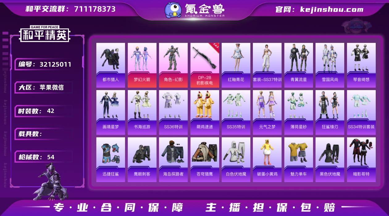 【都市男神梦幻火箭1粉装1特效枪】 苹果V区-15060热力值-42套装-54枪皮 【1稀有】 都市猎人【1粉装】 梦幻火箭【1特效枪】 DP-28-豹影疾电(5级)【66热门】 浪漫天命 鹰眼刺客 破蛋小黄鸡 迅捷狂鲨 暗影哥特(红眼罩) 白色伏地魔 Mini14-梦幻火箭 AUG-幻影战神 M762-天降萌叽 魅力单车 猎鹰 漫步者 黑色伏地魔 海岛探路者 AA12-G-雨过天青 沙漠之鹰-雨过天青 平底锅-画境星梦 M16A4-雨过天青 雨过天青 MG-36-薄荷星砂 GROZA-福马献瑞 SS34特训 撬棍-冰晶雪宝 AWM-天降萌叽 破片手榴弹-爆破雪人 ACE32-冰晶雪宝 青翼流星 狂鲨锋刃 SS36特训 魂电 狙击之神 S12K-幻影战神 ACE32-画境星梦 M1加兰德-画境星梦 琴音绮想 AKM-涂鸦街区 SS35特训 薄荷星砂 元气之梦 AKM-霓彩脉冲 AUG-异域银装 MP5K-画境星梦 十字弩-异域银装 AA12-G-画境星梦 雪国风尚 破片手榴弹-拽到爆炸 信号枪-异瞳寒姬 十字弩-异瞳寒姬 Famas-霓彩脉冲 SVD-霓彩脉冲 SLR-霓彩脉冲 铝热弹-炫彩糖果 UZI-炫彩糖果 AUG-冰晶雪宝 MK20-H-狂鲨锋刃 SPAS-12-狂鲨锋刃 M249-冰晶雪宝 萌鸡速递 书海巡游 SS37特训 炫彩糖果 AMR-雨过天青 PKM-雨过天青 红釉青花 画境星梦 阳光菠萝【2飞行器】 极意拳锋飞行器 炫彩糖果飞行器【10背包】 幻影战神背包(3级) 异域银装背包(3级) 甜蜜菠萝背包(3级) 薄荷星砂背包(3级) 异瞳寒姬背包(3级) 萌鸡速递背包(3级) 炫彩糖果背包(3级) 极意拳锋背包(3级) 狂鲨锋刃背包(3级) 梦幻火箭背包(3级) 营地ID:1024833486