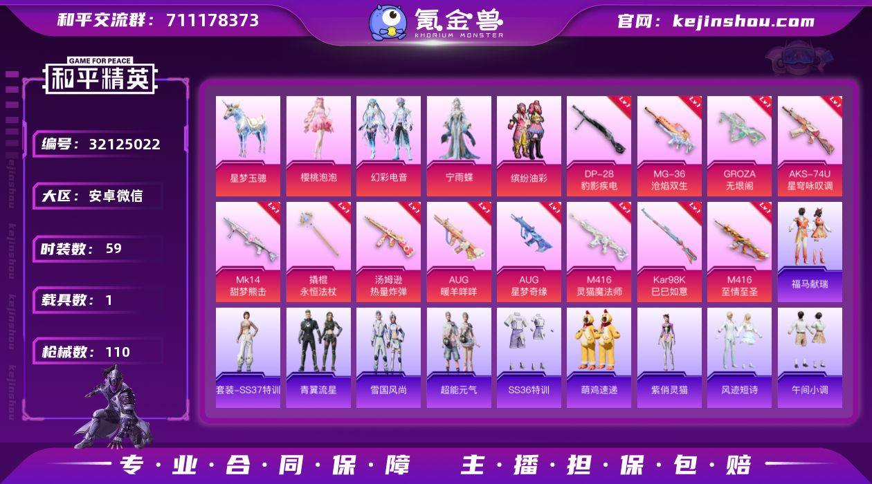 可二次实名【AUG星梦奇缘小番茄 9级至情至圣 14特效枪4粉装1载具】 安卓V区-35866热力值-59套装-110枪皮 【1载具】 星梦玉骢【1稀有】 红熊茄茄(权威小潘茄)【4粉装】 缤纷油彩(猪脸妹) 角色-樱桃泡泡 角色-宁雨蝶 幻彩电音【14特效枪】 AUG-星梦奇缘(3级) M416-至情至圣(9级) M416-灵猫魔法师(3级) Mk14-福马献瑞(3级) ACE32-萌骑漫游(4级) 汤姆逊-热量炸弹(5级) GROZA-无垠阁(3级) 撬棍-永恒法杖(6级) Kar98K-巳巳如意(5级) AKS-74U-星穹咏叹调(4级) Mk14-甜梦熊击(5级) AUG-暖羊咩咩(5级) DP-28-豹影疾电(5级) MG-36-沧焰双生(5级)【134热门】 迅捷狂鲨 M762-彩虹符号 DBS-彩虹符号 M249-彩虹符号 MG3-幻世战舞者 酷萌兔限定 S1897-糯团青竹 红熊茄茄 蓝调潮影 超感刻度 P90-紫矿核心 GROZA-紫矿核心 顶瓜瓜 瑰石海星 JS9-辉云木星 MG-36-薄荷星砂 GROZA-福马献瑞 恋语绒绒 SS34特训 漫游都市 朱霞炽焰 撬棍-冰晶雪宝 时希公主 福马献瑞 大橘大利 超能元气 凌霄紫焰 小鸟芋圆 蓝冰羽 破片手榴弹-爆破雪人 ACE32-冰晶雪宝 鱼渊荷华 青翼流星 M24-天降萌叽 PKM-啾咪啾咪 燕燕于飞 SS31特训 SS33特训 SS32特训 巳巳如意 紫幽梦 雪绒豹 MG3-霓彩脉冲 狂鲨锋刃 SS36特训 异域银装 战术大师 JS9-凌霄紫焰 MG-36-凌霄紫焰 蜜獾-启元战纹 ARX-凌霄紫焰 云朵鹅 Kar98K-星穹咏叹调 P92-凌霄紫焰 MK20-H-星梦奇缘 顽皮玉兔 平底锅-凌霄紫焰 狙击之神 AKS-74U-鬼刀 破片手榴弹-海盐豹豹 UMP45-海盐豹豹 甜心蒙太奇 Mk14-薄荷星砂 AMR-鸡智如我 AMR-喜羊羊与灰太狼 燃烧瓶-福马献瑞 PKM-紫幽梦 Mini14-香桃花海 破片手榴弹-巳巳如意 Mk14-紫幽梦 AKM-涂鸦街区 蝎式手枪-千金淑